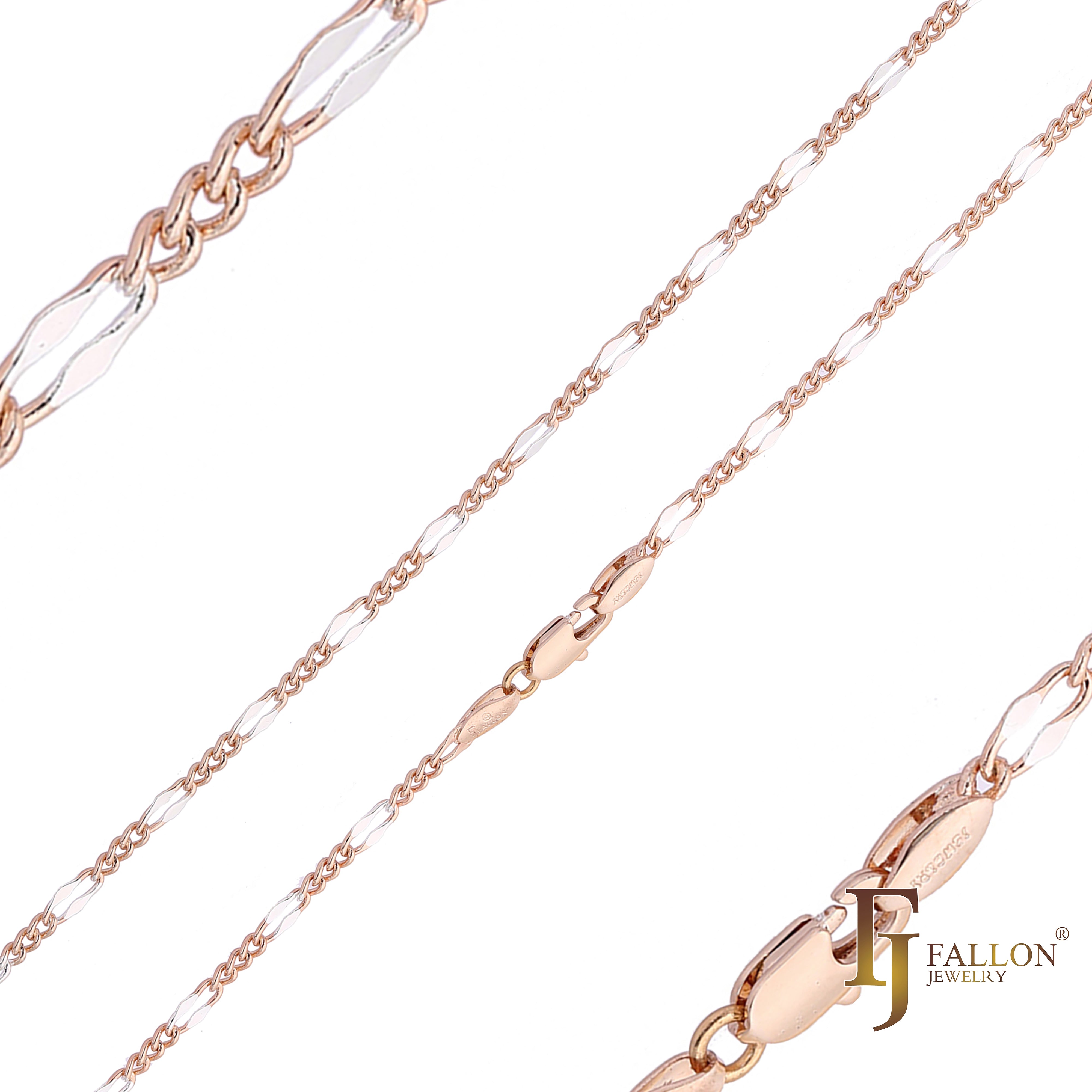 Thin Figaro Fancy cable link chains plated in 14K Gold, Rose Gold, two tone