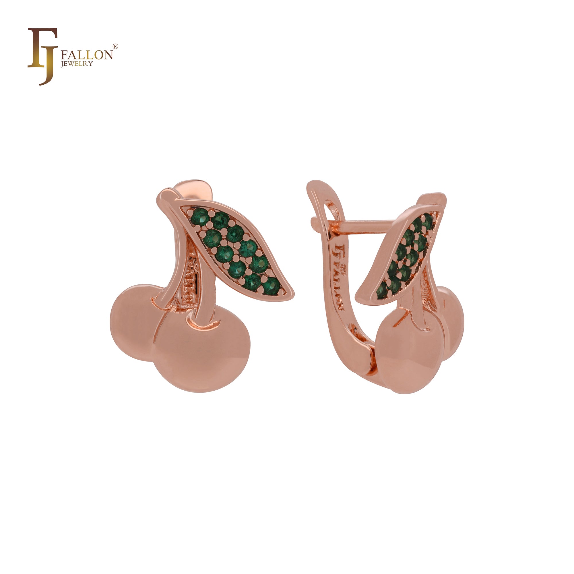 Little cherries with emerald green leave Rose Gold Child Earrings