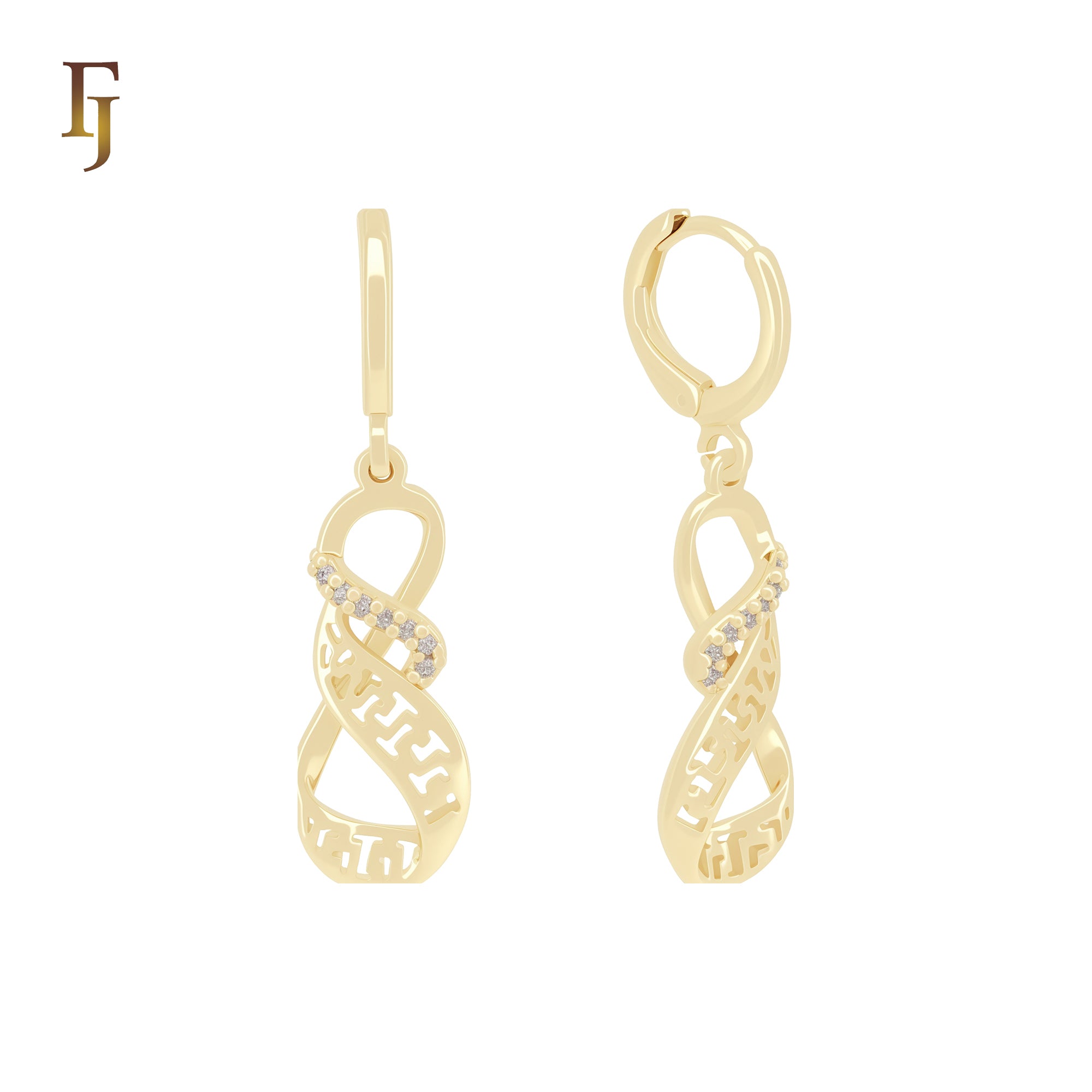 Greek Key meander 14K Gold White CZs drop Huggie Earrings