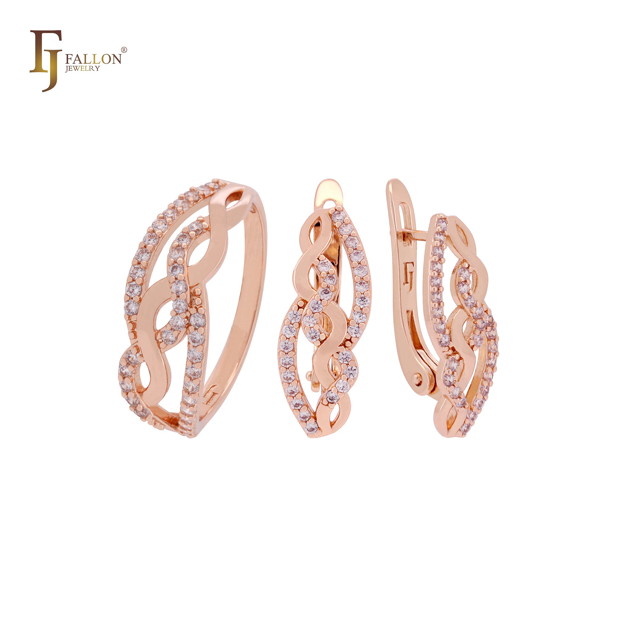 Twisted interlocking crossing ribbons with double white CZs Rose Gold Jewelry Set with Rings