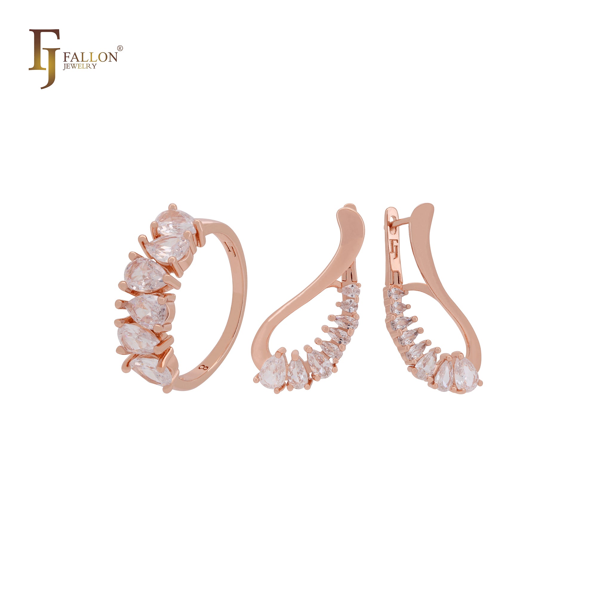 Great Teardrop white CZs Geometric Rose Gold Jewelry Set with Rings