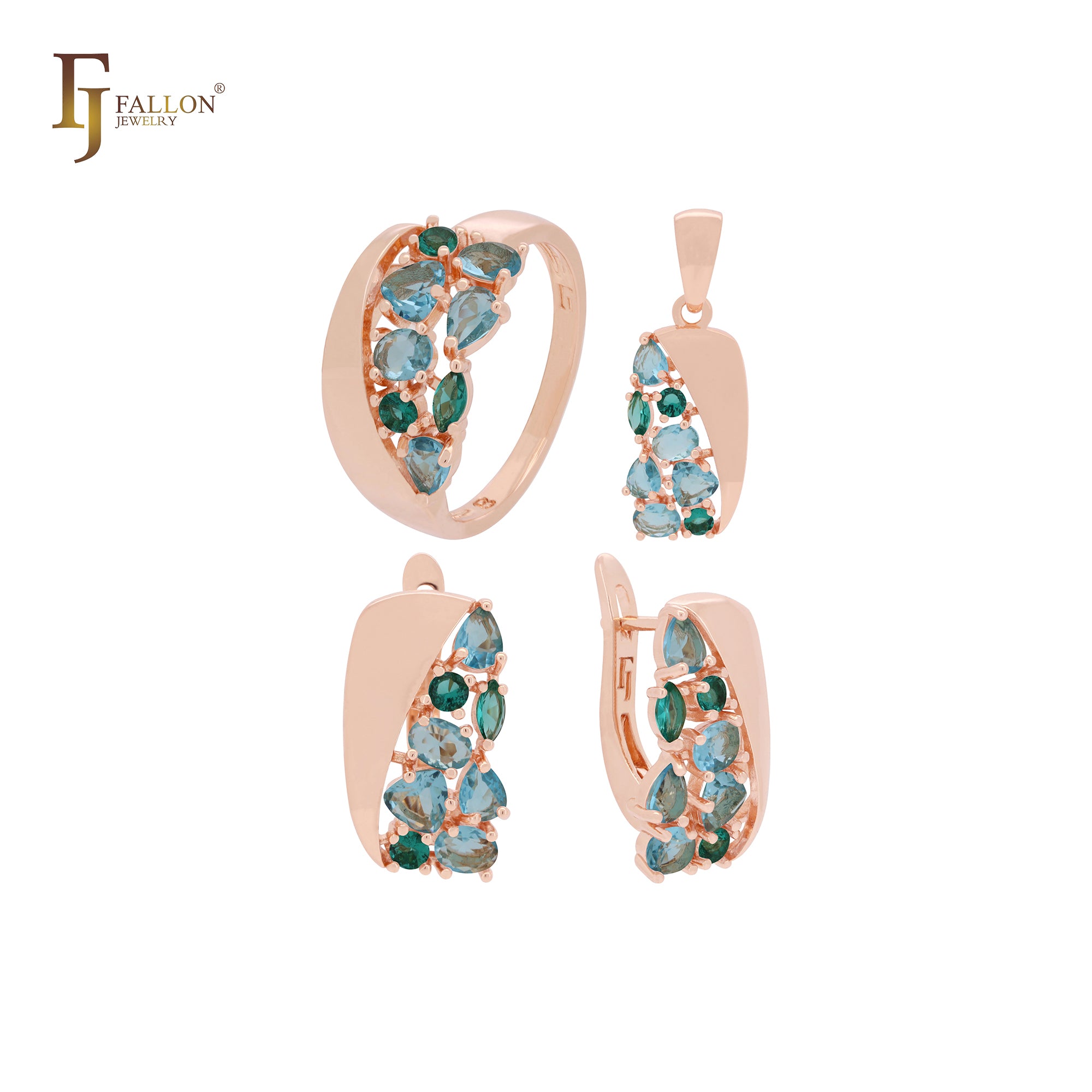 Cluster mixed blue CZs Rose Gold Jewelry Set with Rings and Pendant