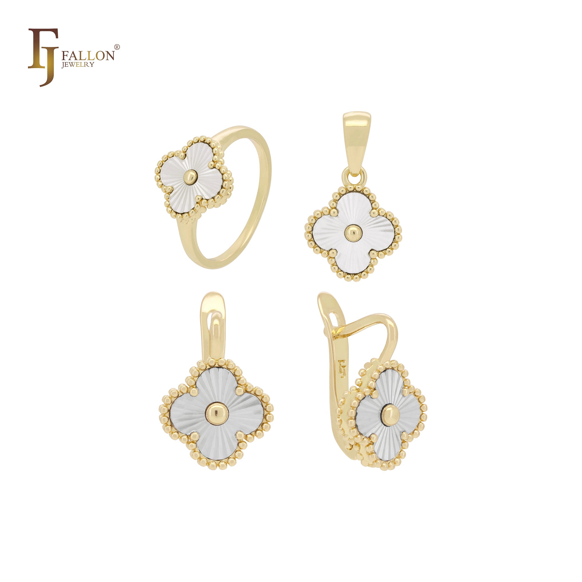 Black and white layered clover 14K Gold, Rose Gold Jewelry Set with Rings and Pendant