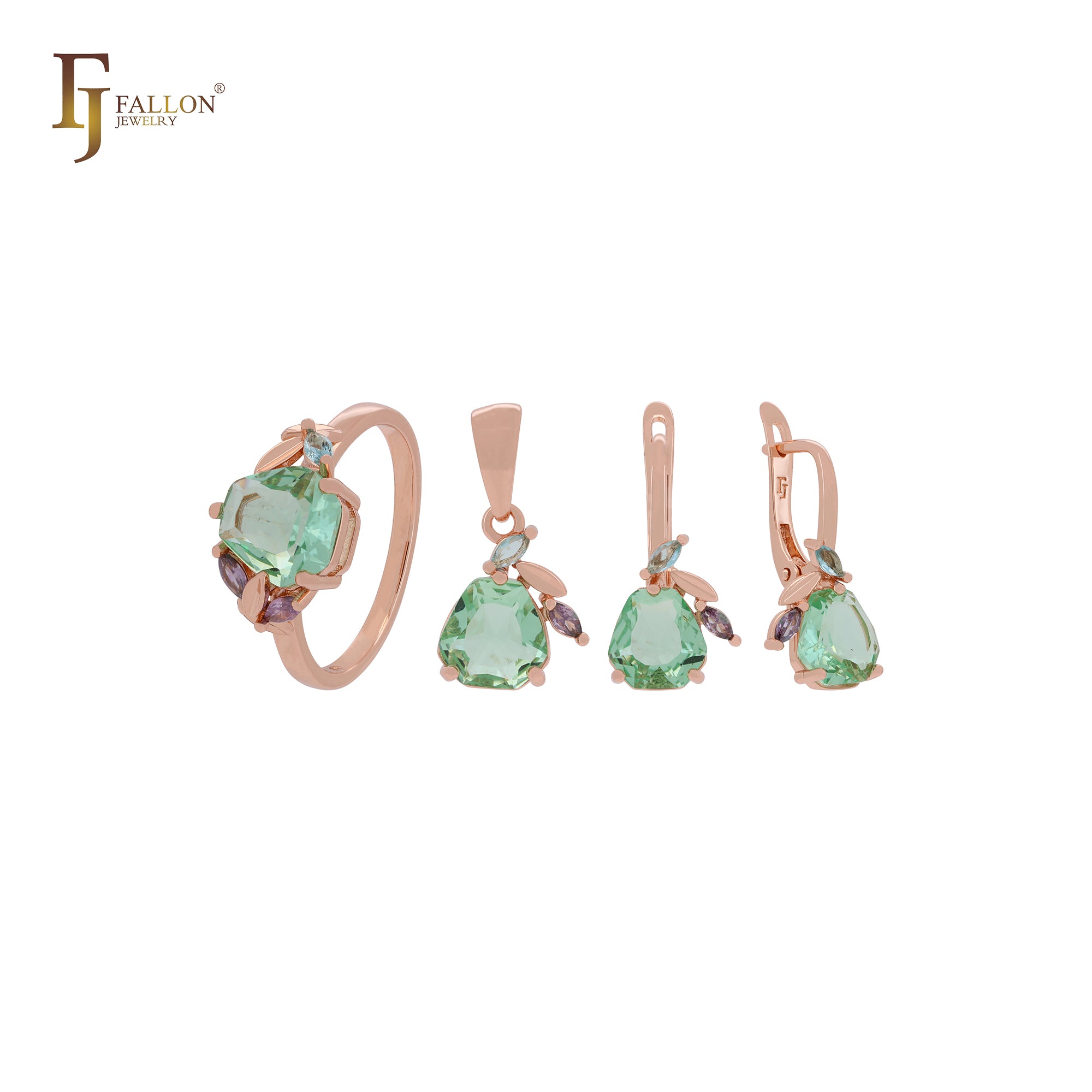 Cluster fruitful leaves colorful CZs Apple green Rose Gold Jewelry Set with Rings and Pendant