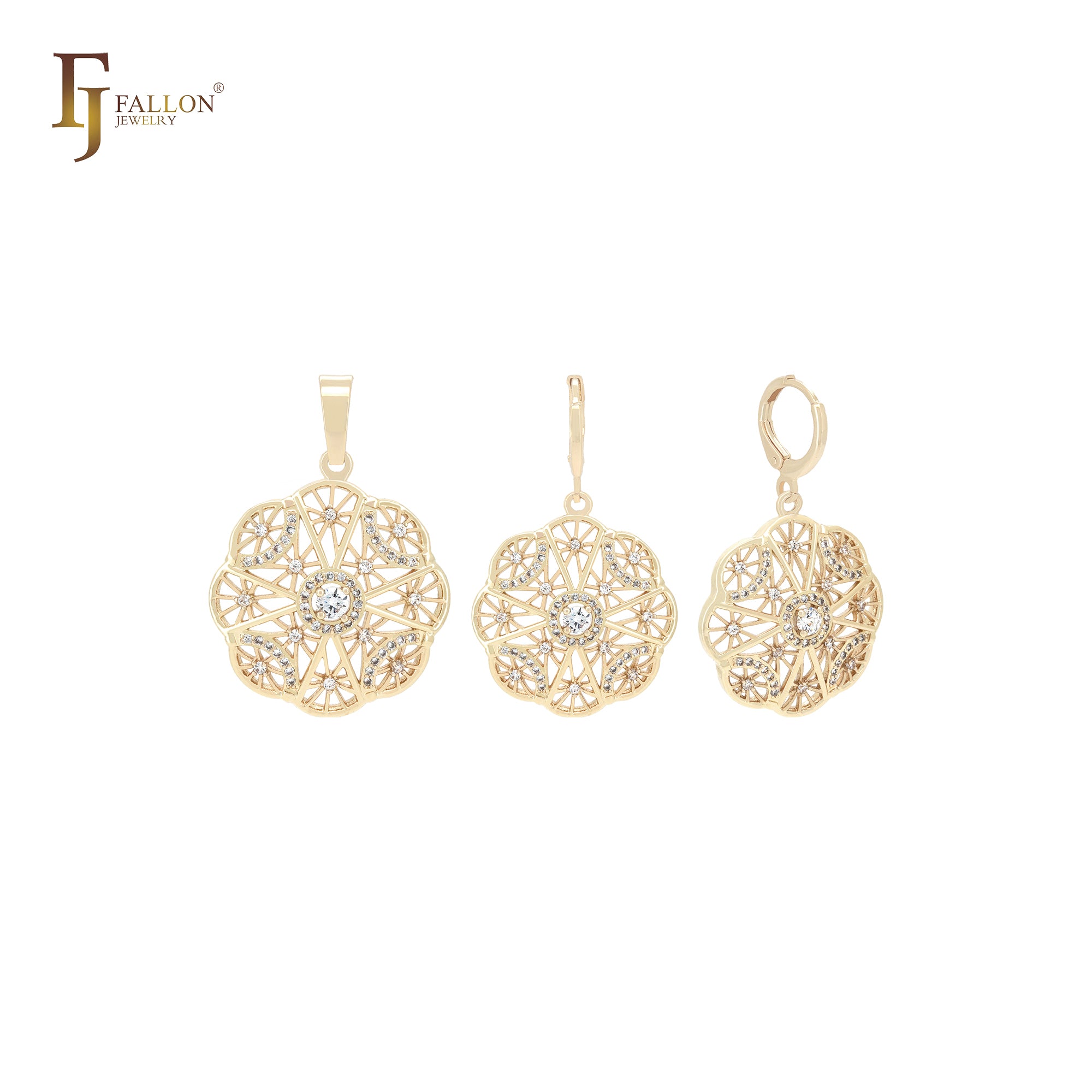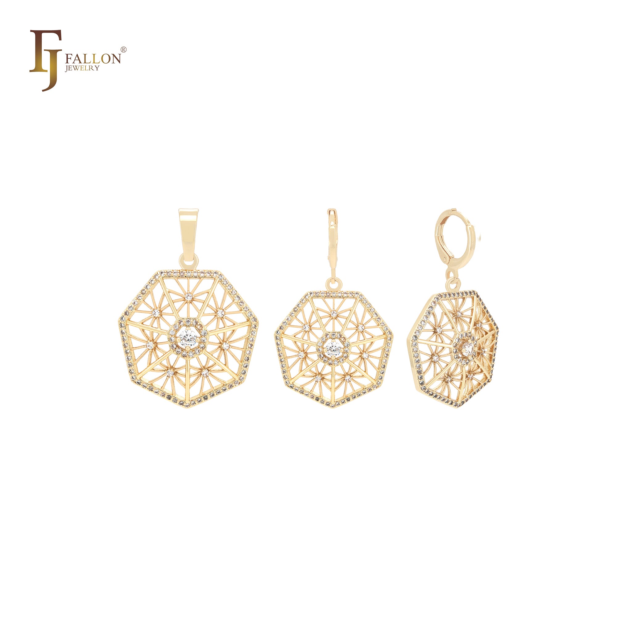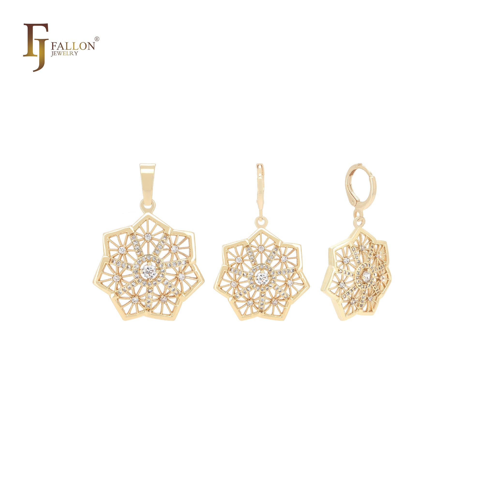 Decagon snowflake shaped white CZs cluster 14K Gold Jewelry Set with Pendant