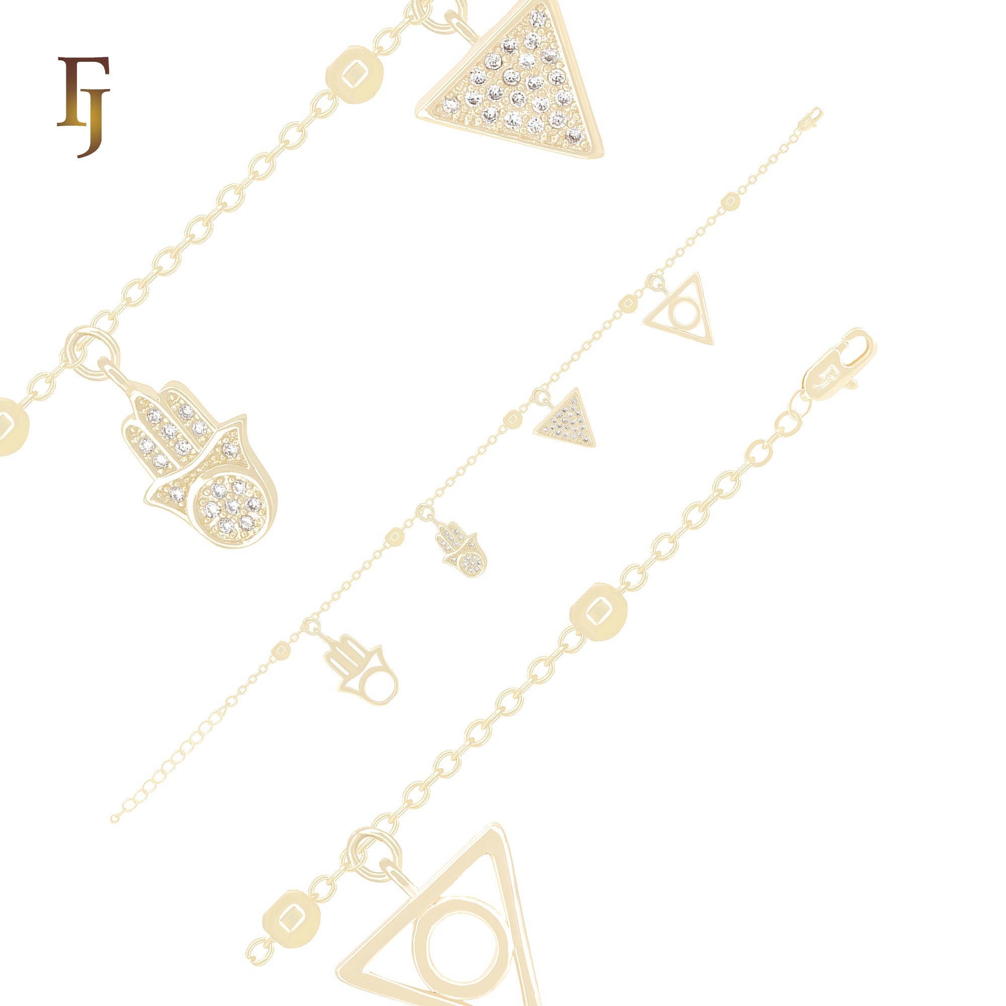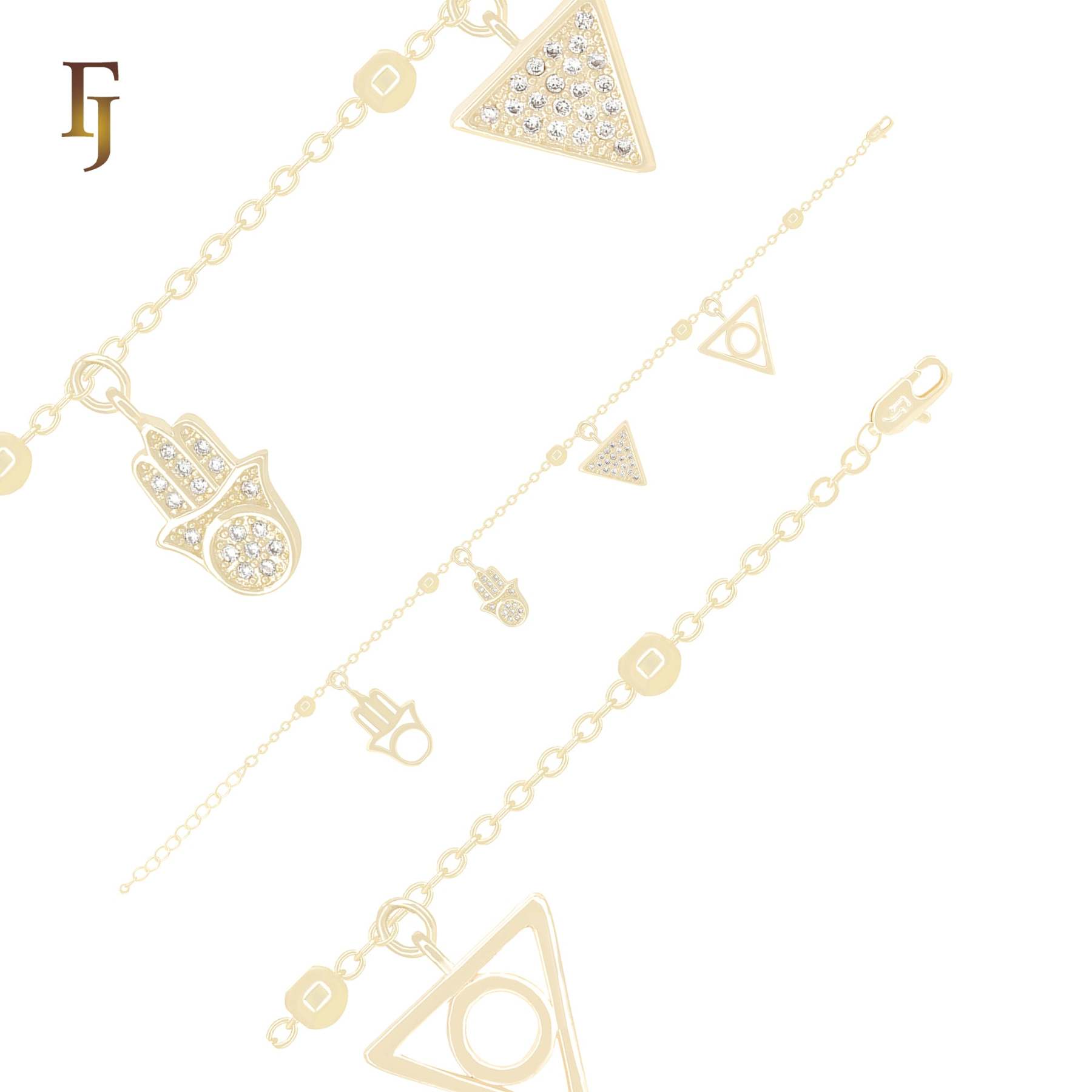 Stylish bracelet featuring geometric triangle and Hamsa hand charms, some adorned with sparkling CZ stones. Plated in 14K gold, this 13mm wide and 19cm long bracelet blends modern style with symbolic meaning—perfect for young girls or as a thoughtful gift.