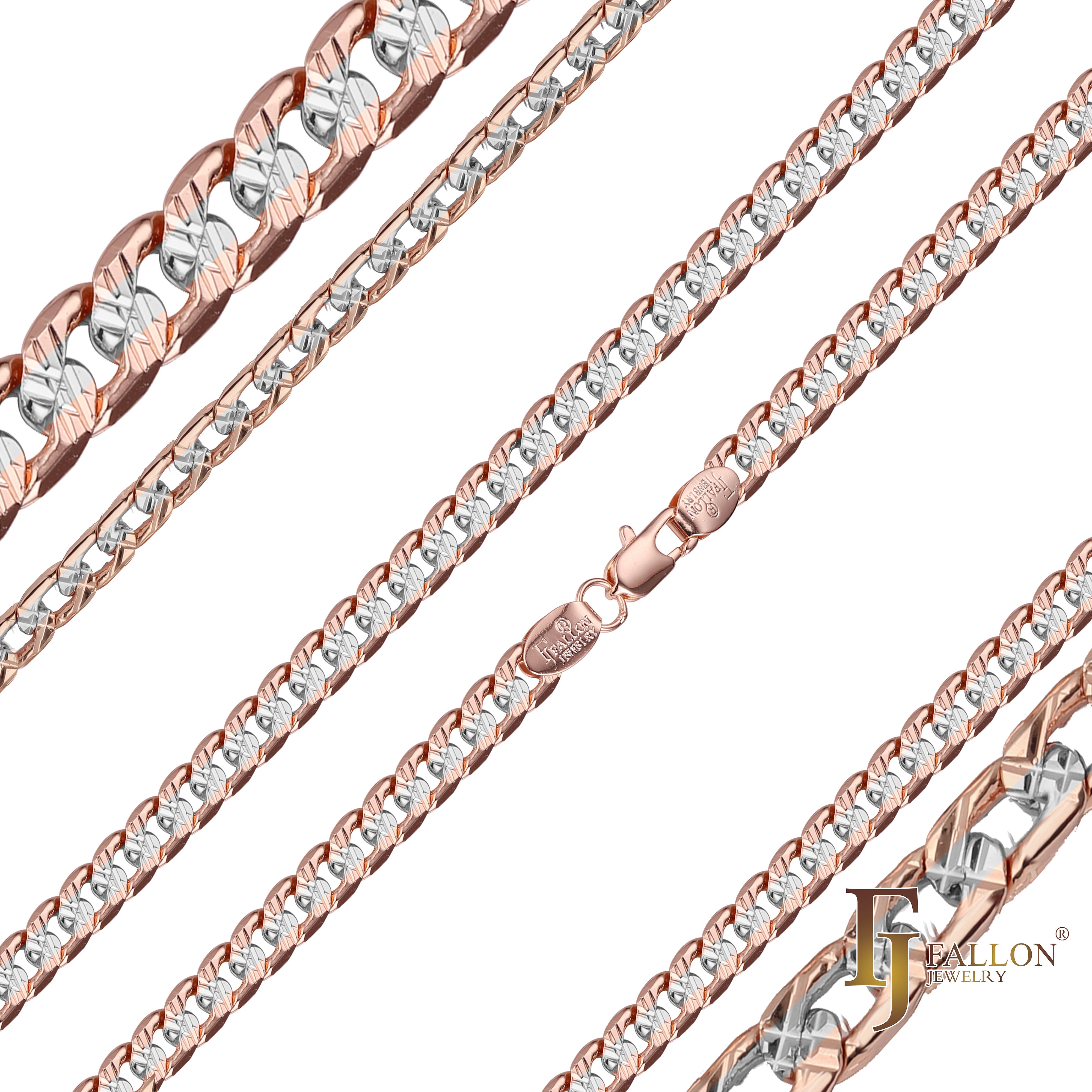 Curb link double cross hammered chains plated in 14K Gold, Rose Gold, two tone