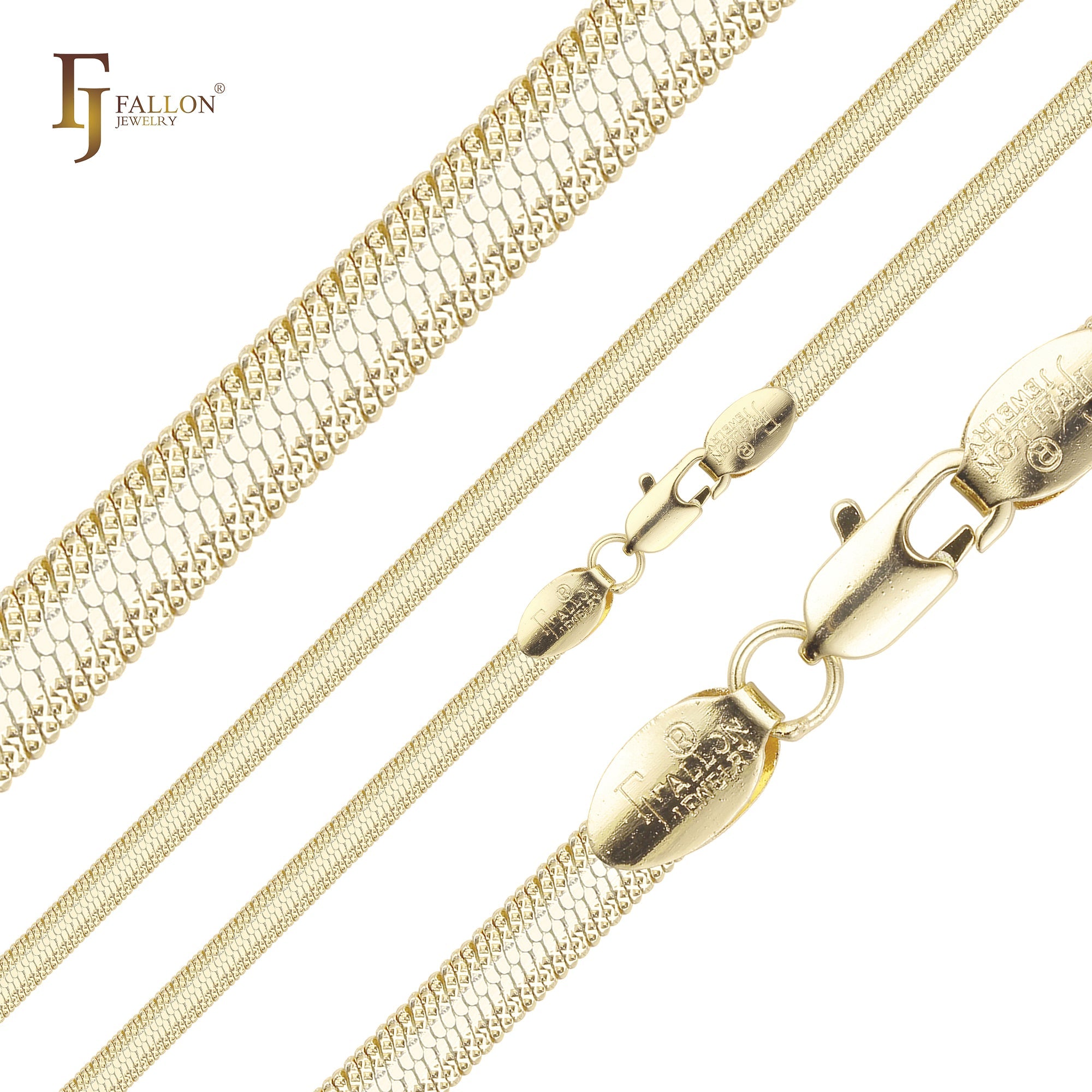 Flat Snake flank cross hammered chains plated in 14K Gold, Rose Gold, two tone