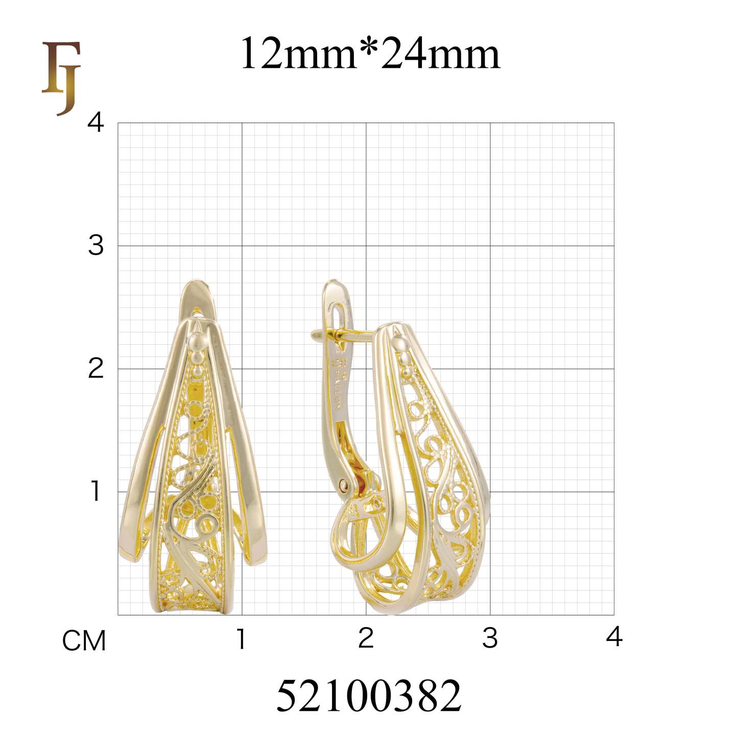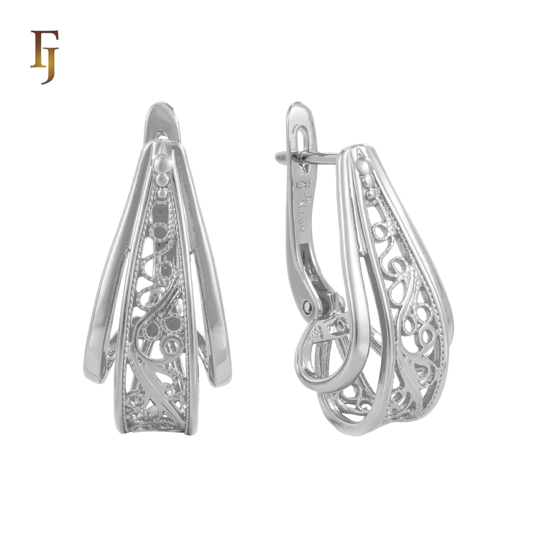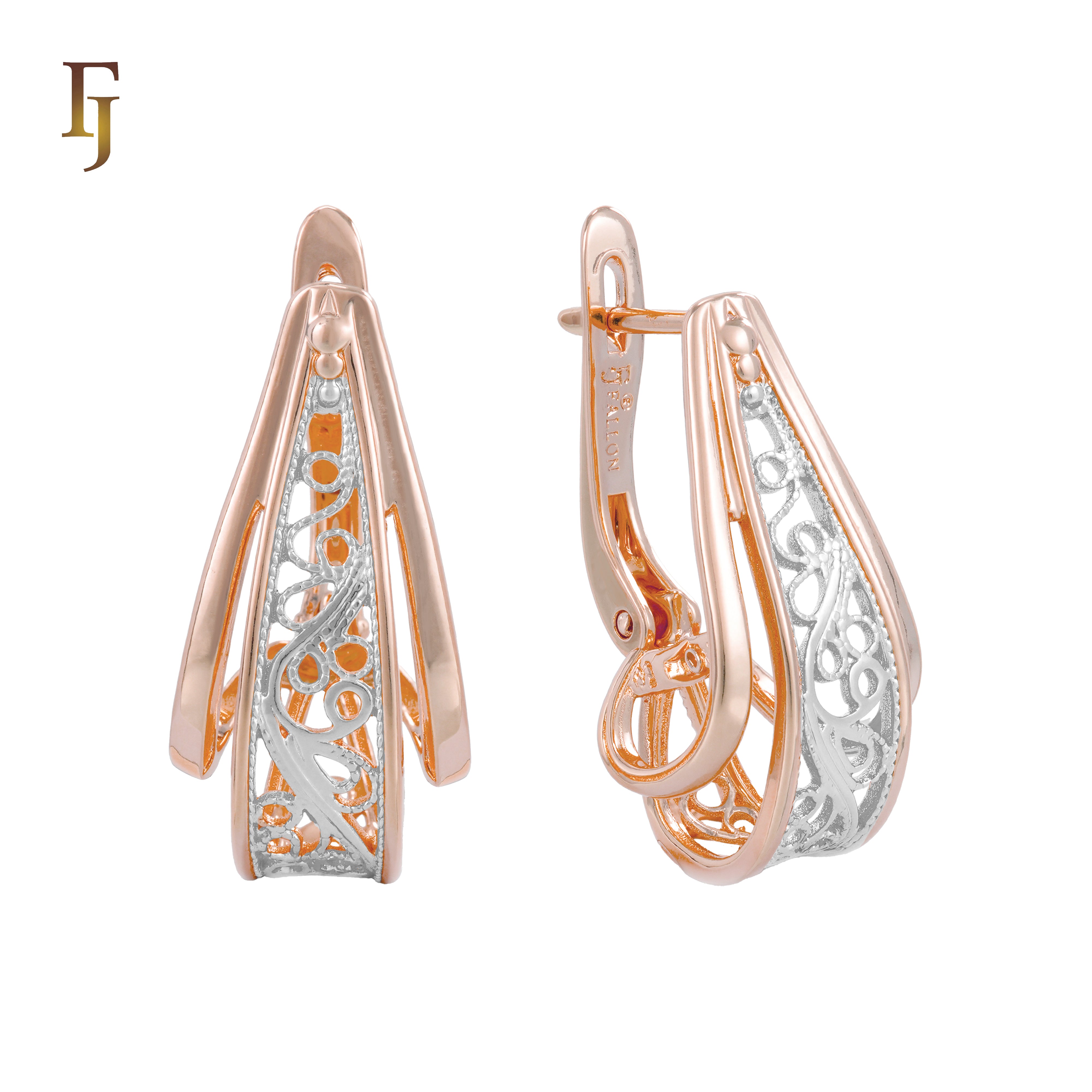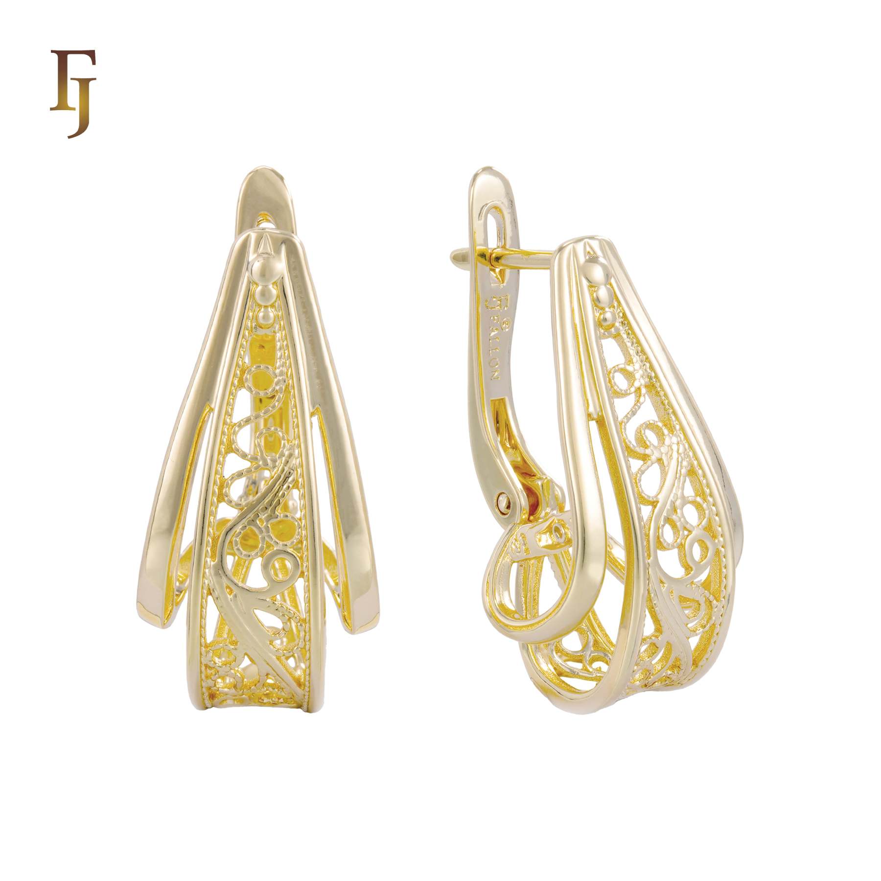 These gold-plated earrings feature a unique three-dimensional geometric form with intricate filigree detailing. The layered openwork design adds depth and sophistication, while the secure Russian lock ensures a comfortable and reliable fit. The elegant blend of modern structure and classic filigree makes these earrings perfect for both formal events and refined daily wear. A standout piece for those who appreciate craftsmanship and artistry in their jewelry – from FJ Jewelry.