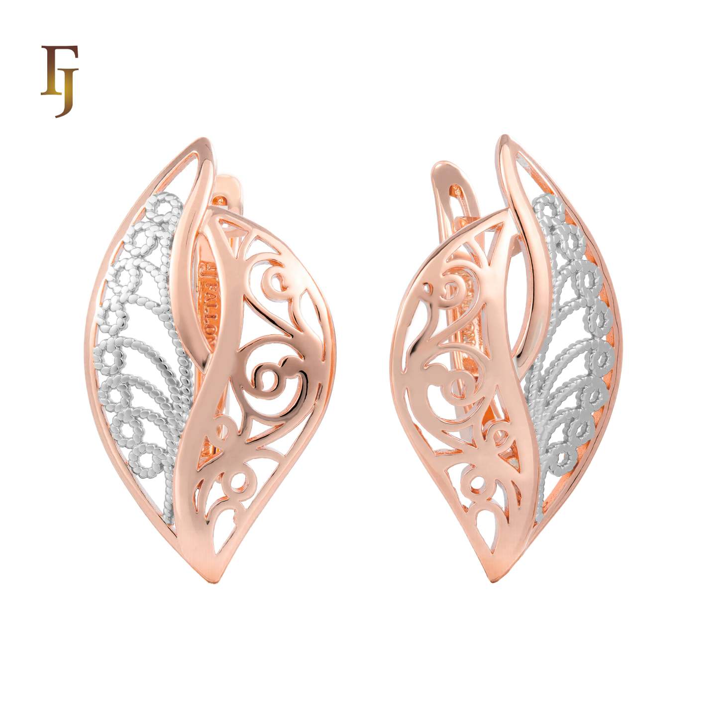 These Russian lock earrings showcase an exquisite fusion of rose gold and white plating, featuring an elegant leaf-shaped design with intricate filigree cutouts. The graceful curves and contrasting textures add a touch of refinement and uniqueness, perfect for women who appreciate artistic detail. With a secure Russian lock clasp, these earrings offer both style and comfort. Ideal for formal events, daily elegance, or as a special gift, this sophisticated pair brings modern luxury and timeless charm to your collection. From FJ Jewelry.