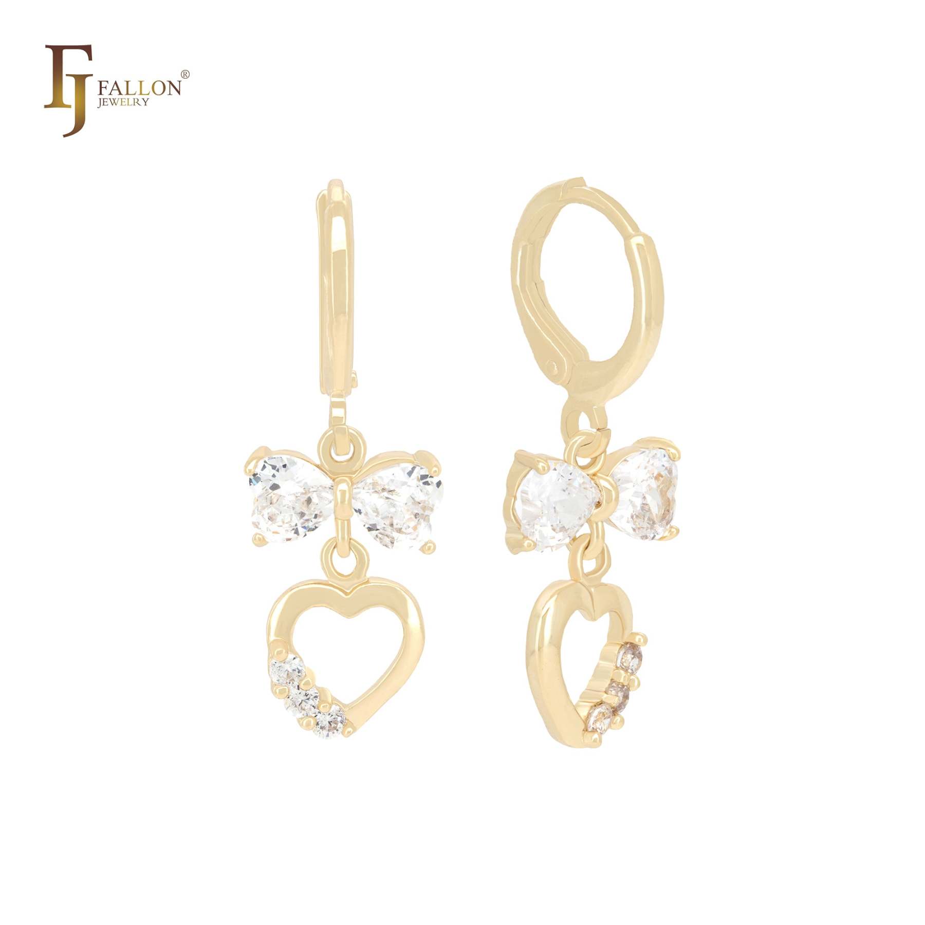Love knot of white CZs drop heart 14K Gold Huggie Earrings