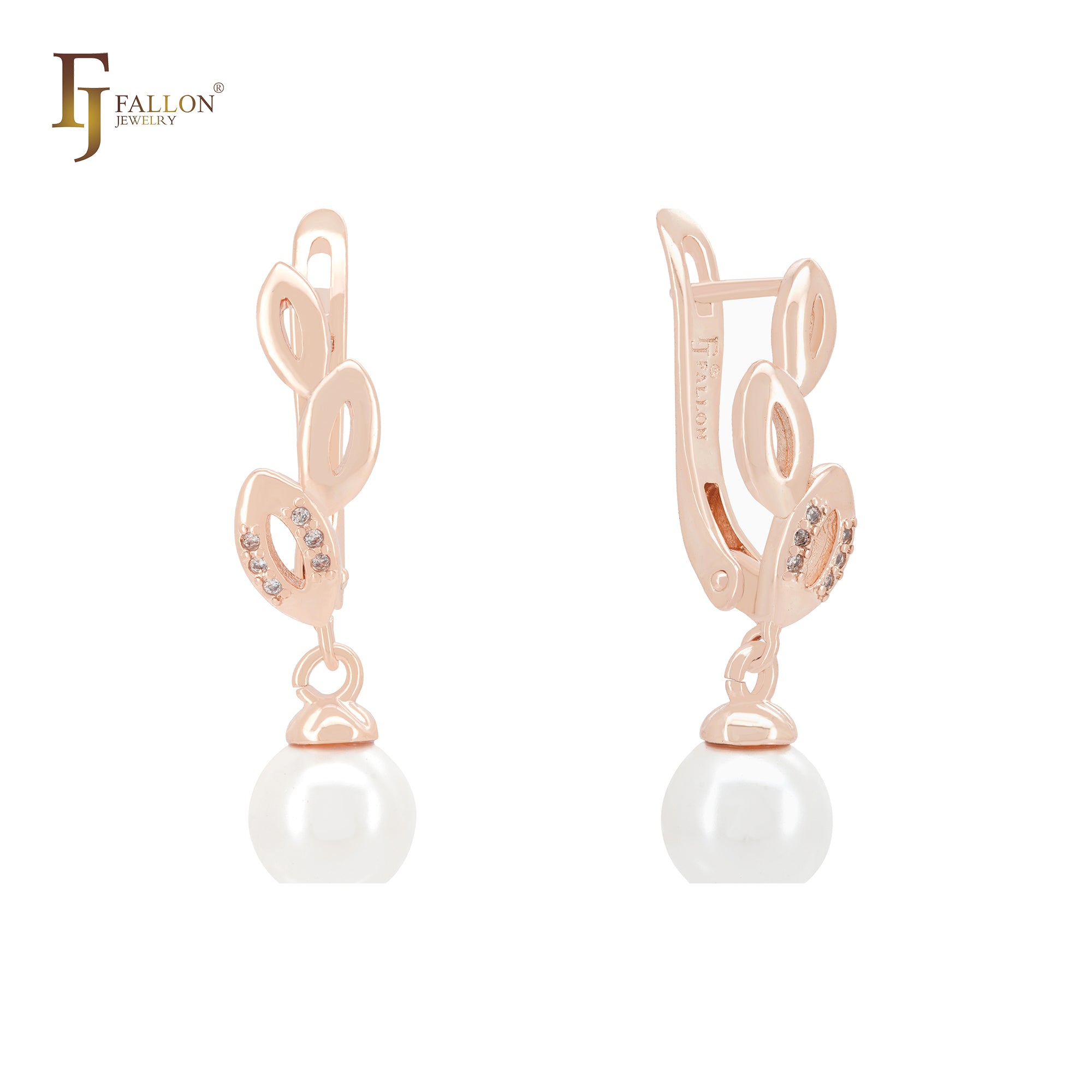 Pearl and leaves drop earrings in 14K Gold, Rose Gold two tone plating colors