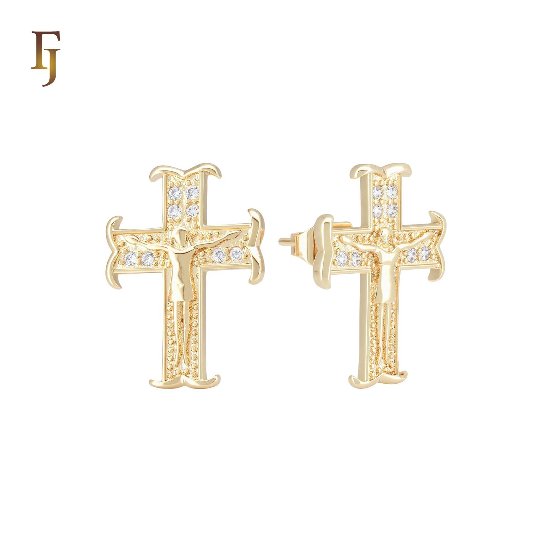 Christian Catholic Crucifix Cross 14K Gold Stud Earrings