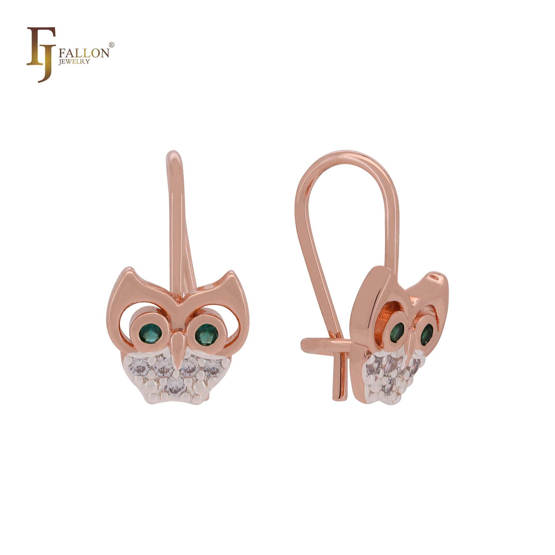 Little owl with emerald and white Rose Gold two tone wire hook Child Earrings