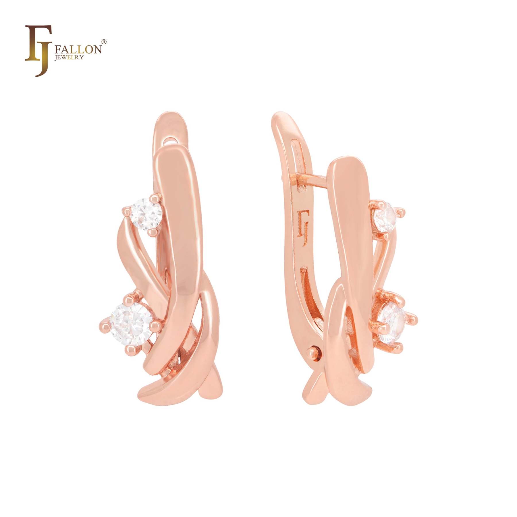 Twisted interlocking crossing ribbons with double white CZs Rose Gold Russian Lock Earrings