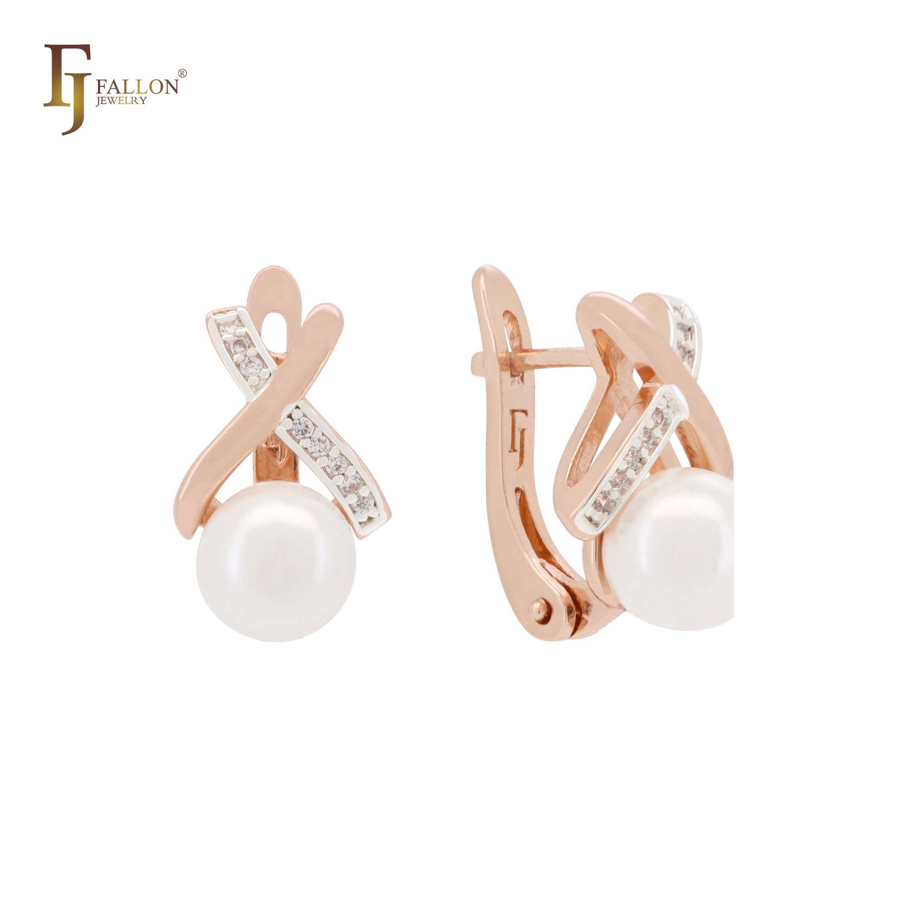 Interlocking white CZs pearl Rose Gold two tone Russian Lock Earrings