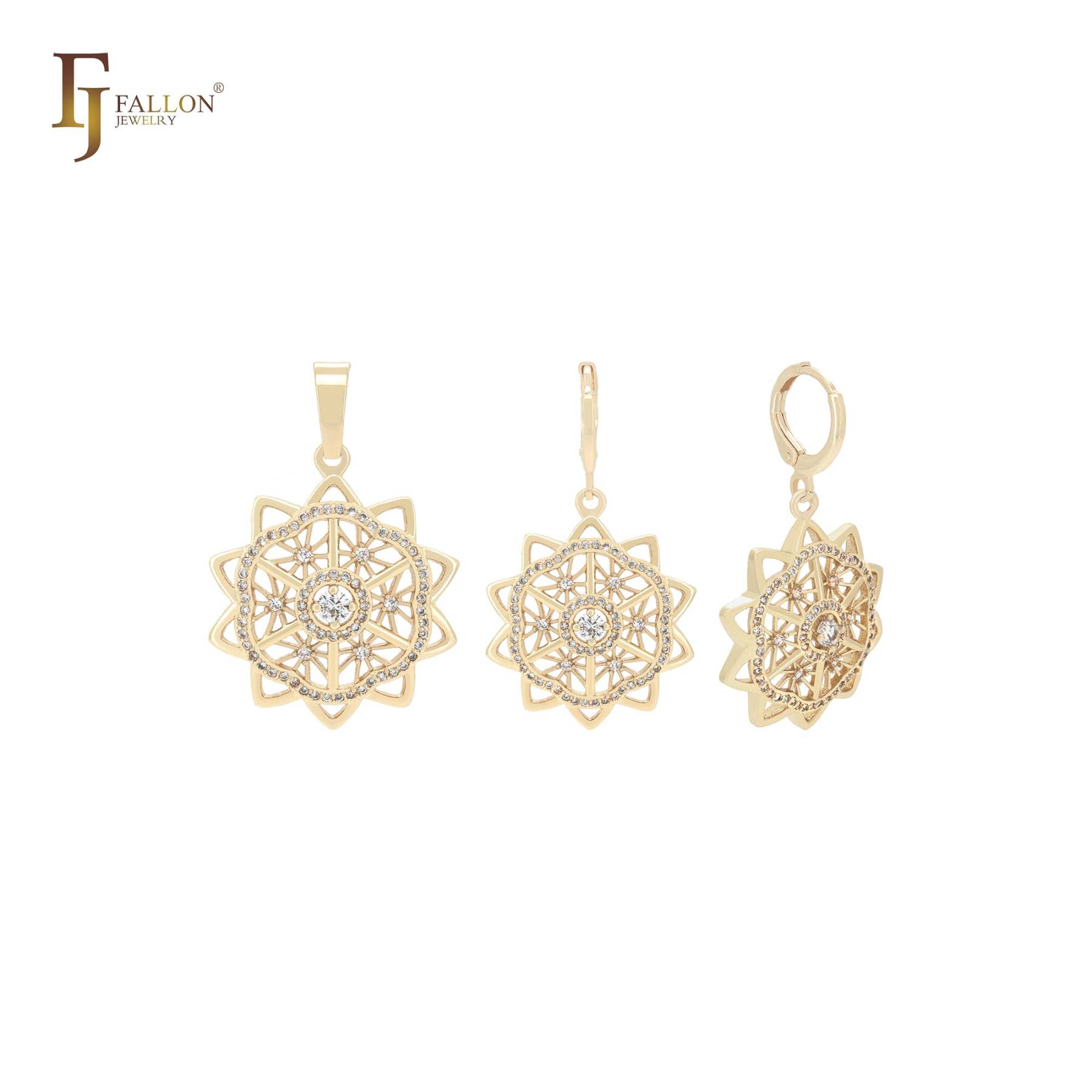 Decagon snowflake shaped white CZs cluster 14K Gold Jewelry Set with Pendant