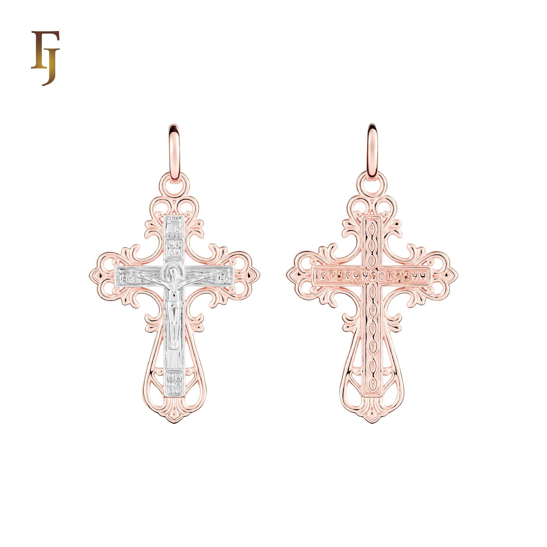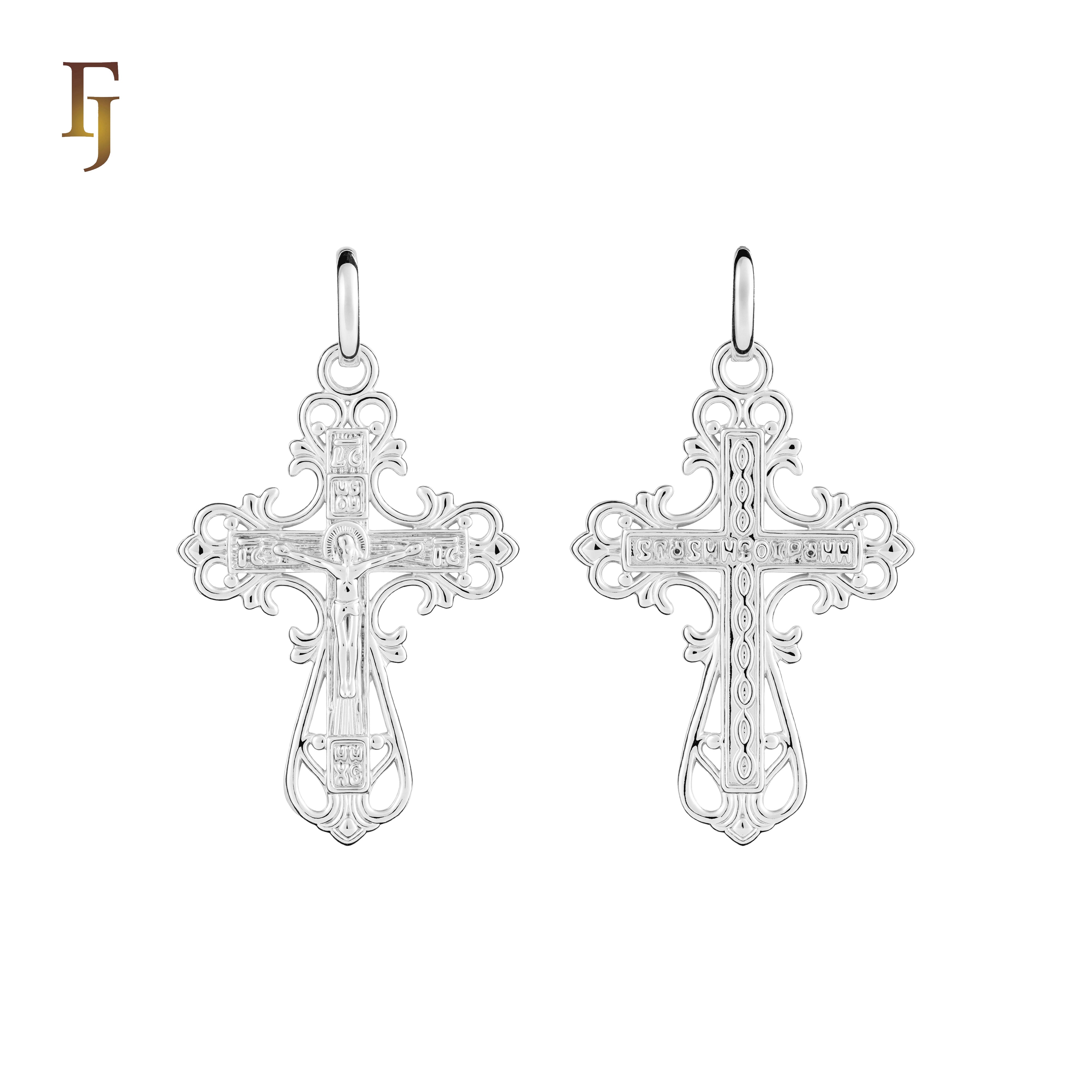 This Orthodox crucifix pendant features an intricate design with a traditional Jesus icon on the front and engraved blessing text on the back. Crafted in 585 gold plating over brass, it reflects deep spiritual meaning and Russian religious heritage, ideal for faithful believers.