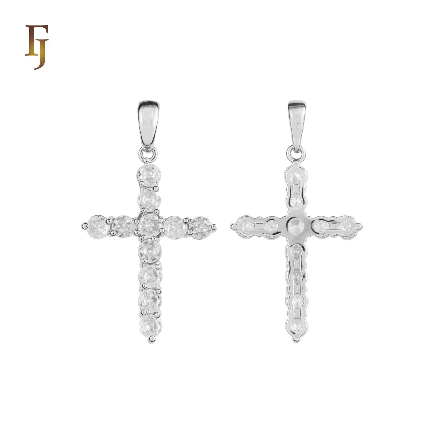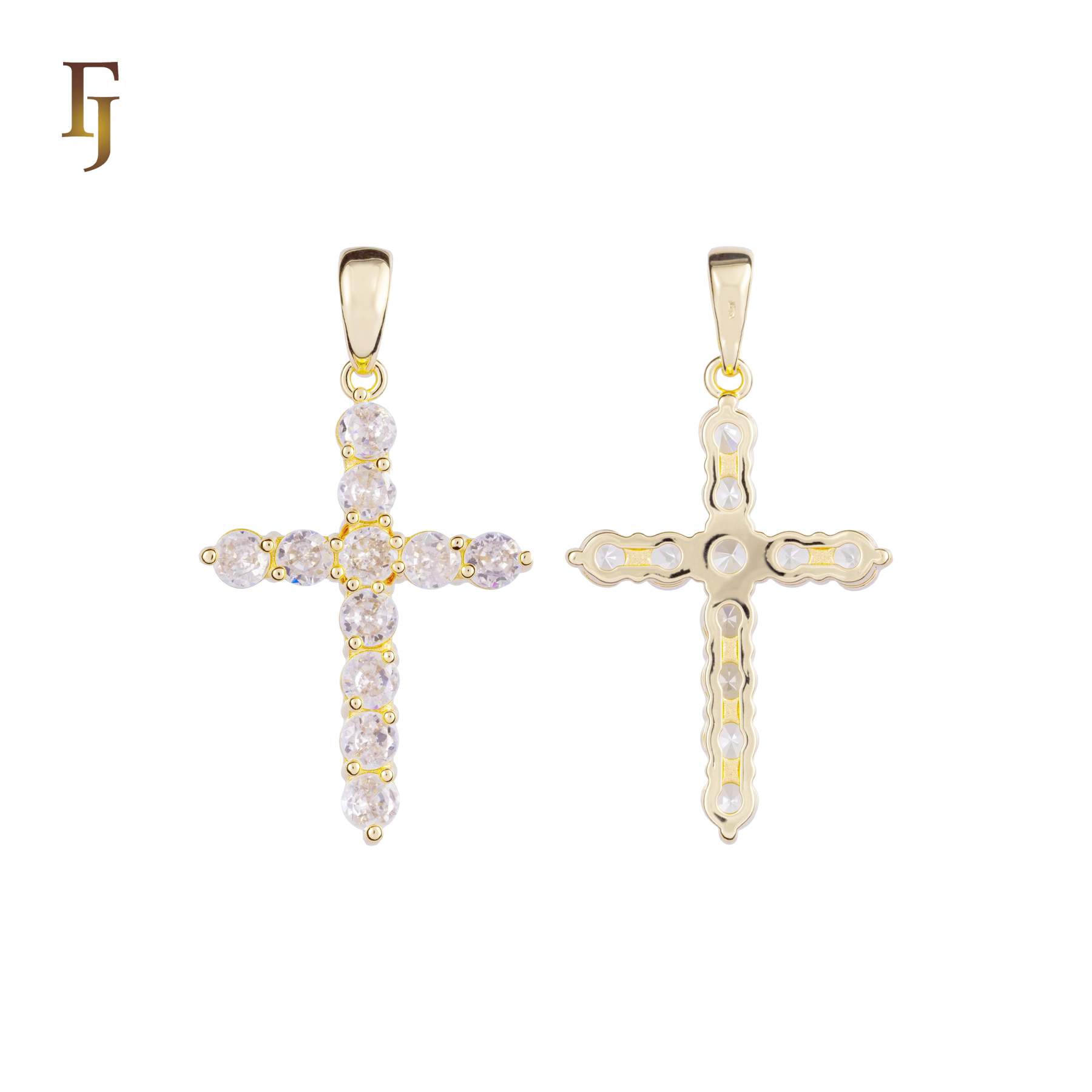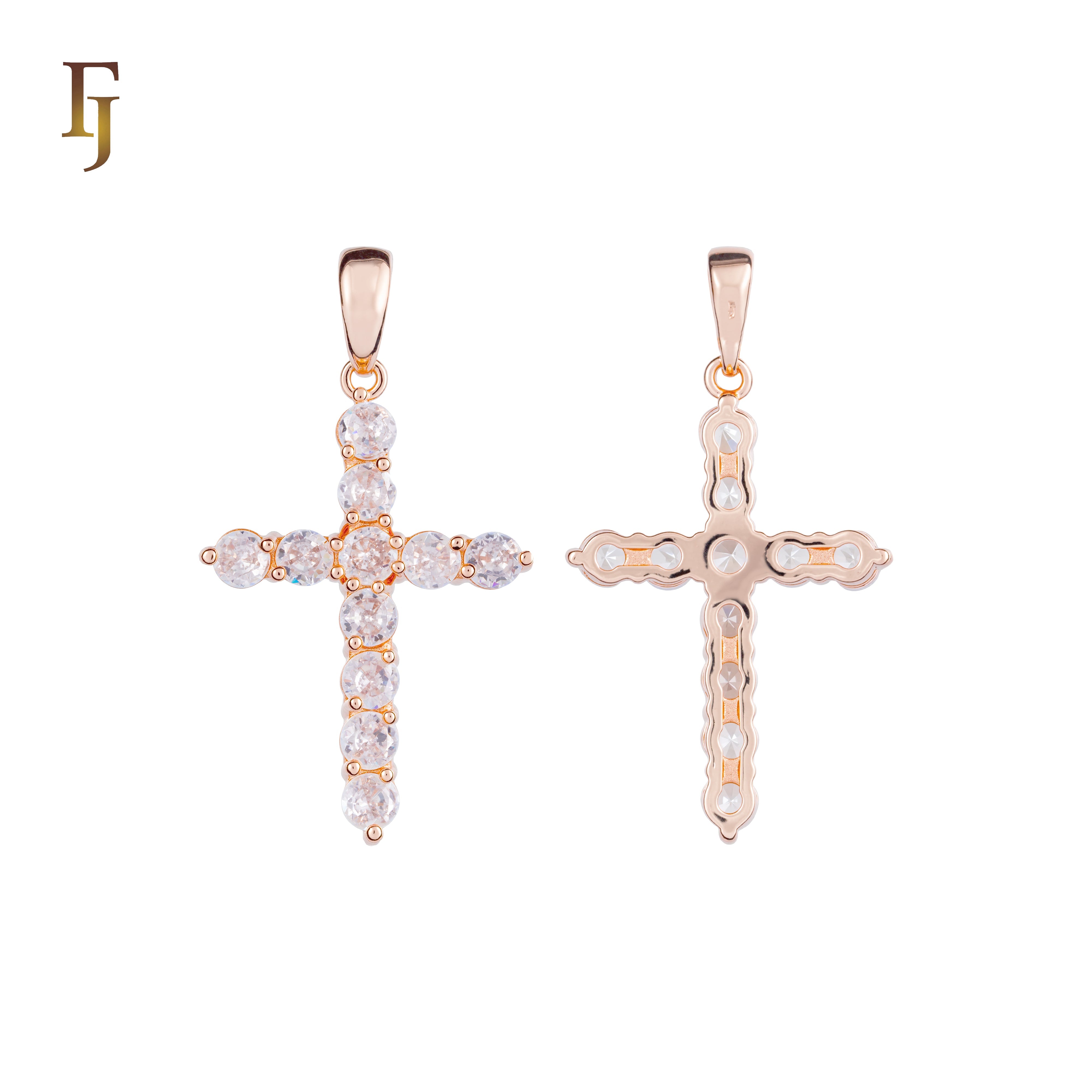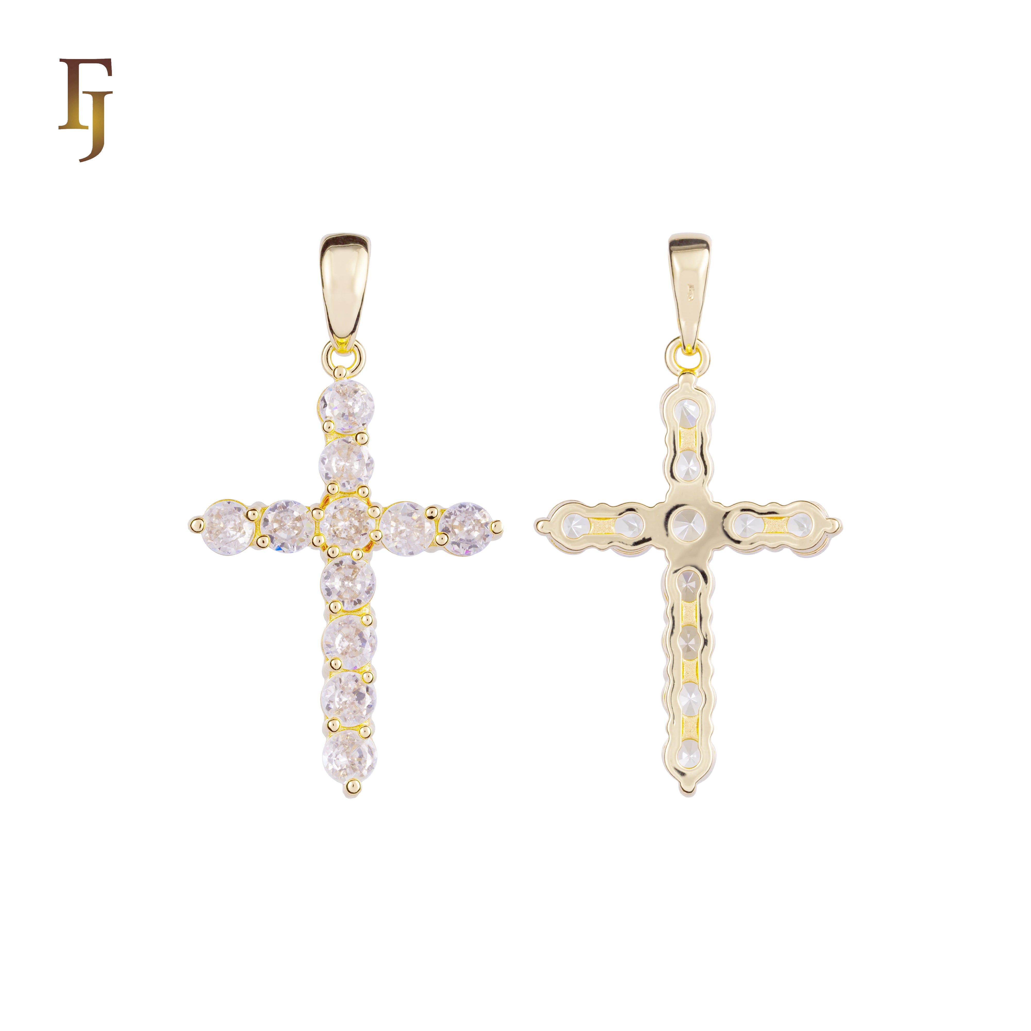 This Latin Cross pendant features a minimalist design crafted with brilliant round CZ stones, arranged in a clean cruciform layout. Plated in 585 gold over a durable brass base, it's a timeless expression of faith and elegance, perfect for everyday wear or gifting.
