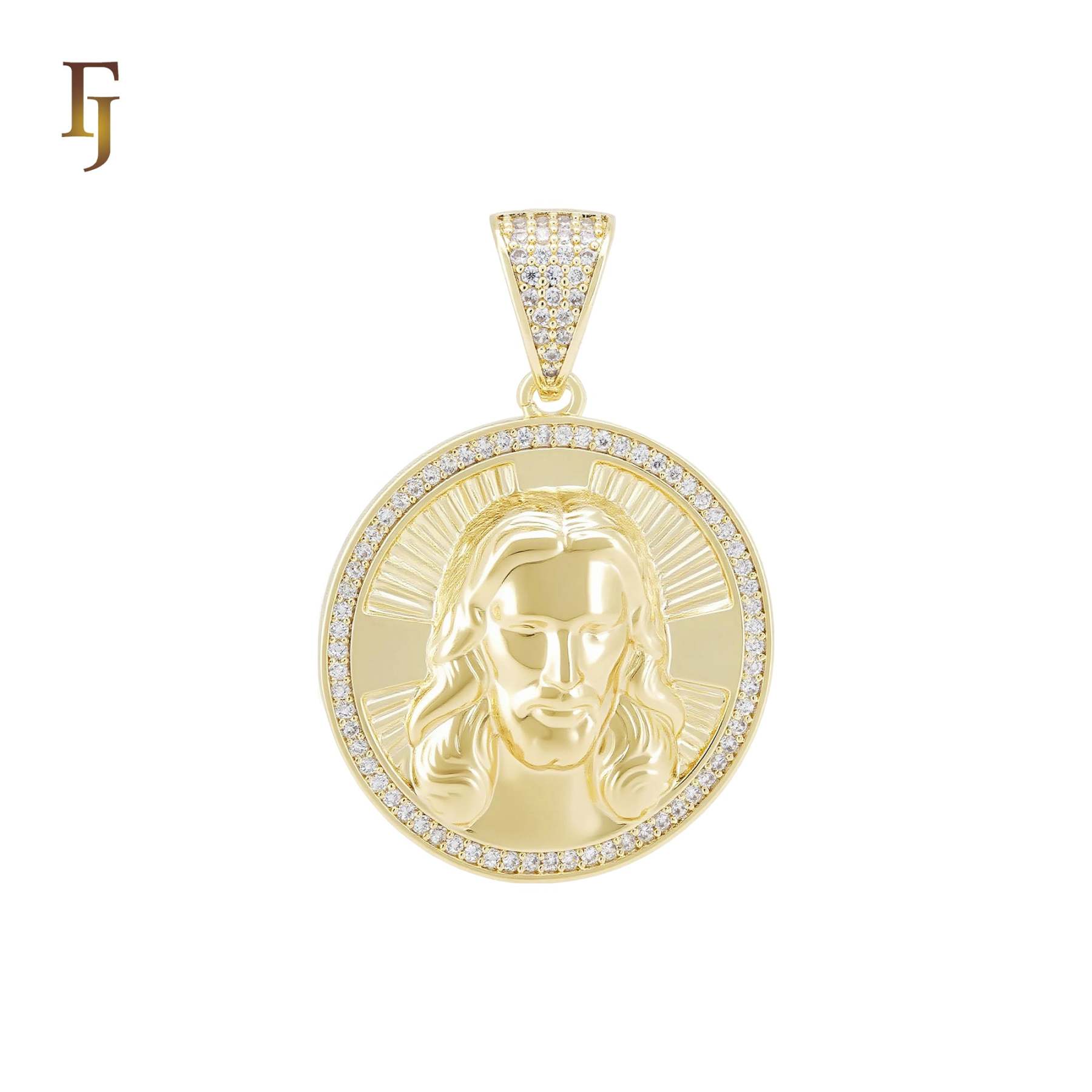 Portrait of Jesus Christian paved halo white CZs 14K Gold Pendant Religious