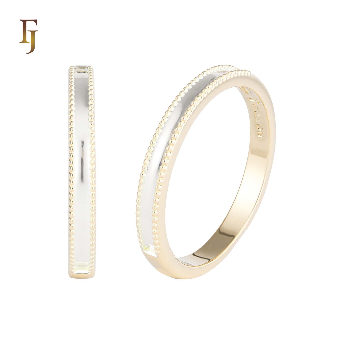 A sleek two-tone band ring featuring delicate beaded edges, combining rose gold and silver plating for a refined, minimalist look. Perfect for stacking or wearing solo for timeless elegance.