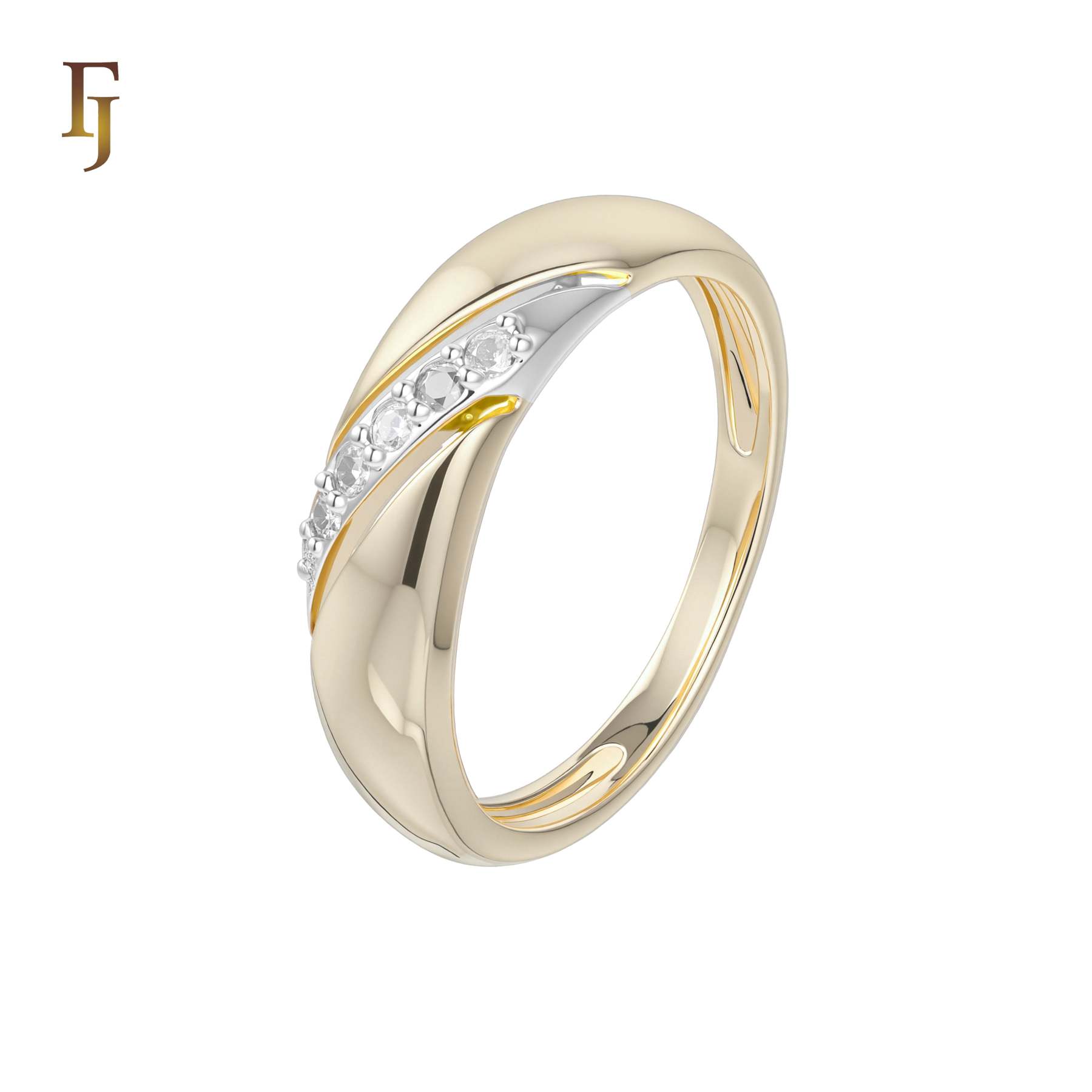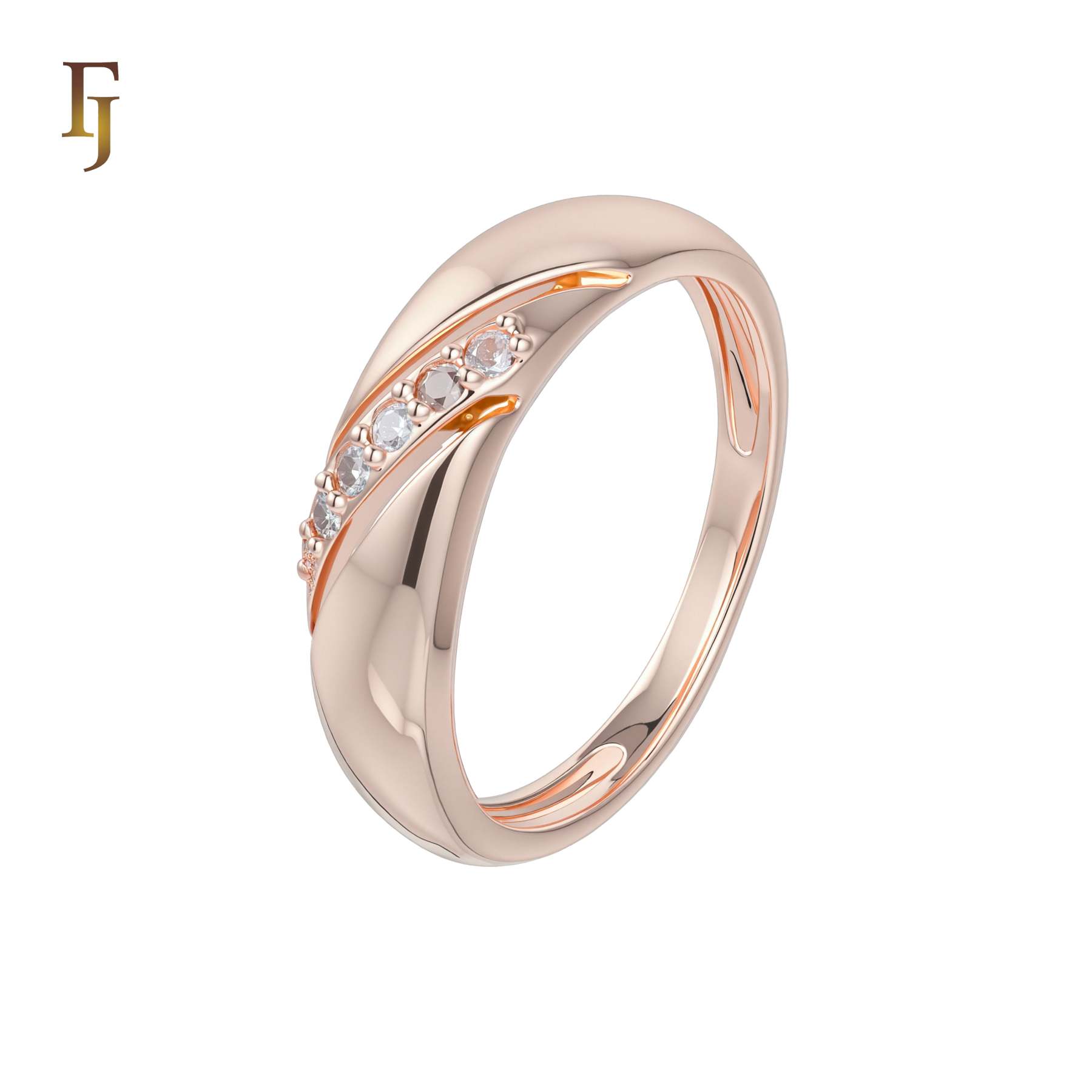 This ring blends timeless curves with modern elegance. The overlapping band design features a delicate line of shimmering white cubic zirconia stones, reminiscent of stardust in motion. Crafted from eco-friendly copper and plated with 14K gold using FJ proprietary long-lasting plating technique, the finish is both brilliant and durable. Hypoallergenic and comfortable for daily wear, it is ideal as a couple’s band, anniversary gift, or a stylish everyday accessory.