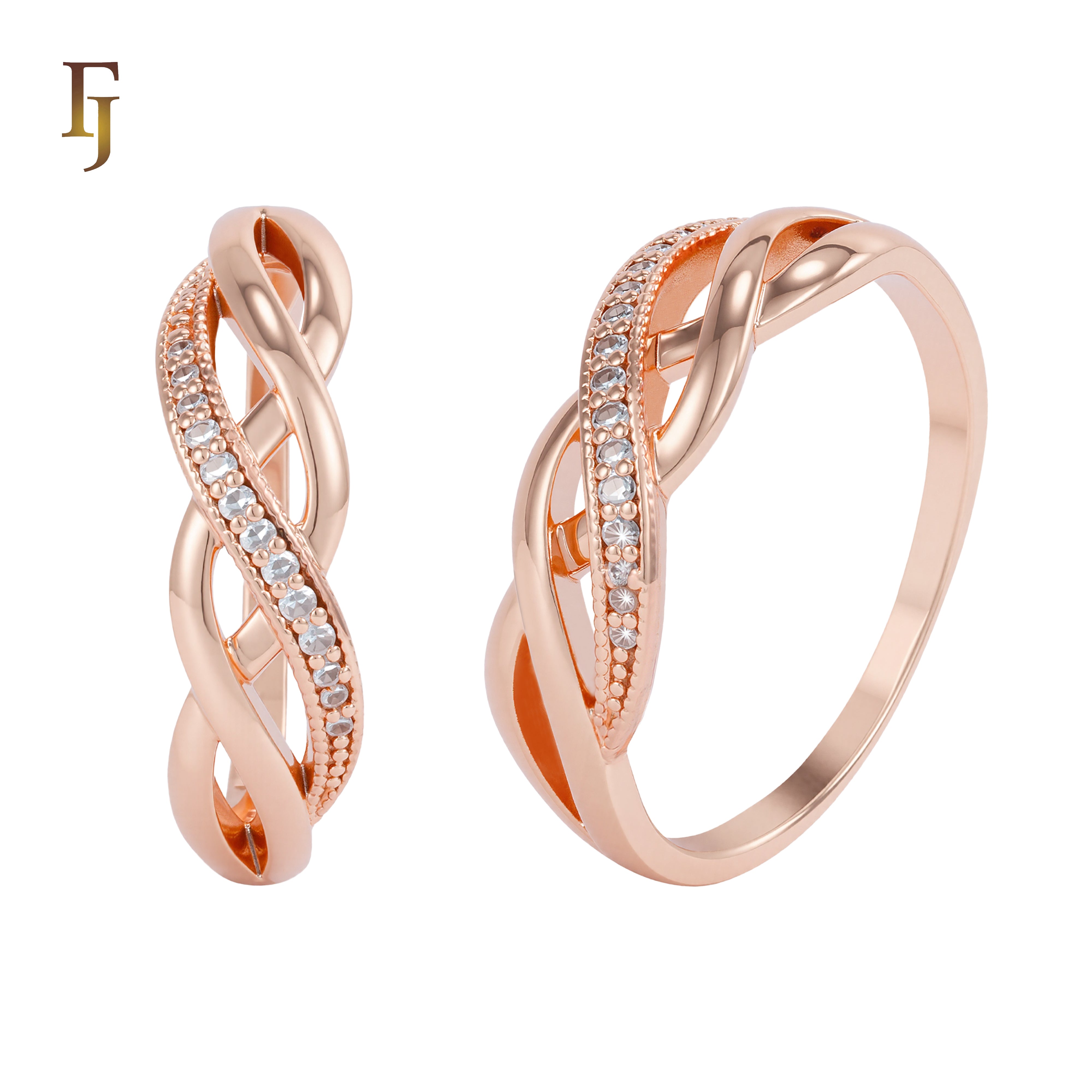 This rose gold plated ring features a graceful twist design, interweaving sleek polished bands with a row of shimmering CZ stones. A timeless and elegant piece perfect for everyday wear, stacking, or as a stylish promise ring.