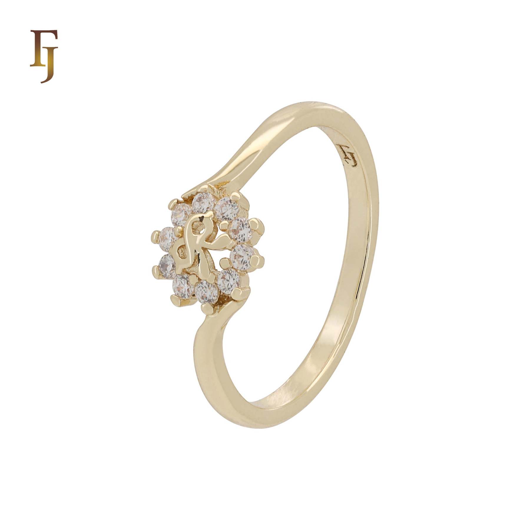 Featuring a sparkling circle of CZ stones around a central R initial, this personalized gold-plated ring embodies elegance and individuality. A perfect gift with meaning and charm.