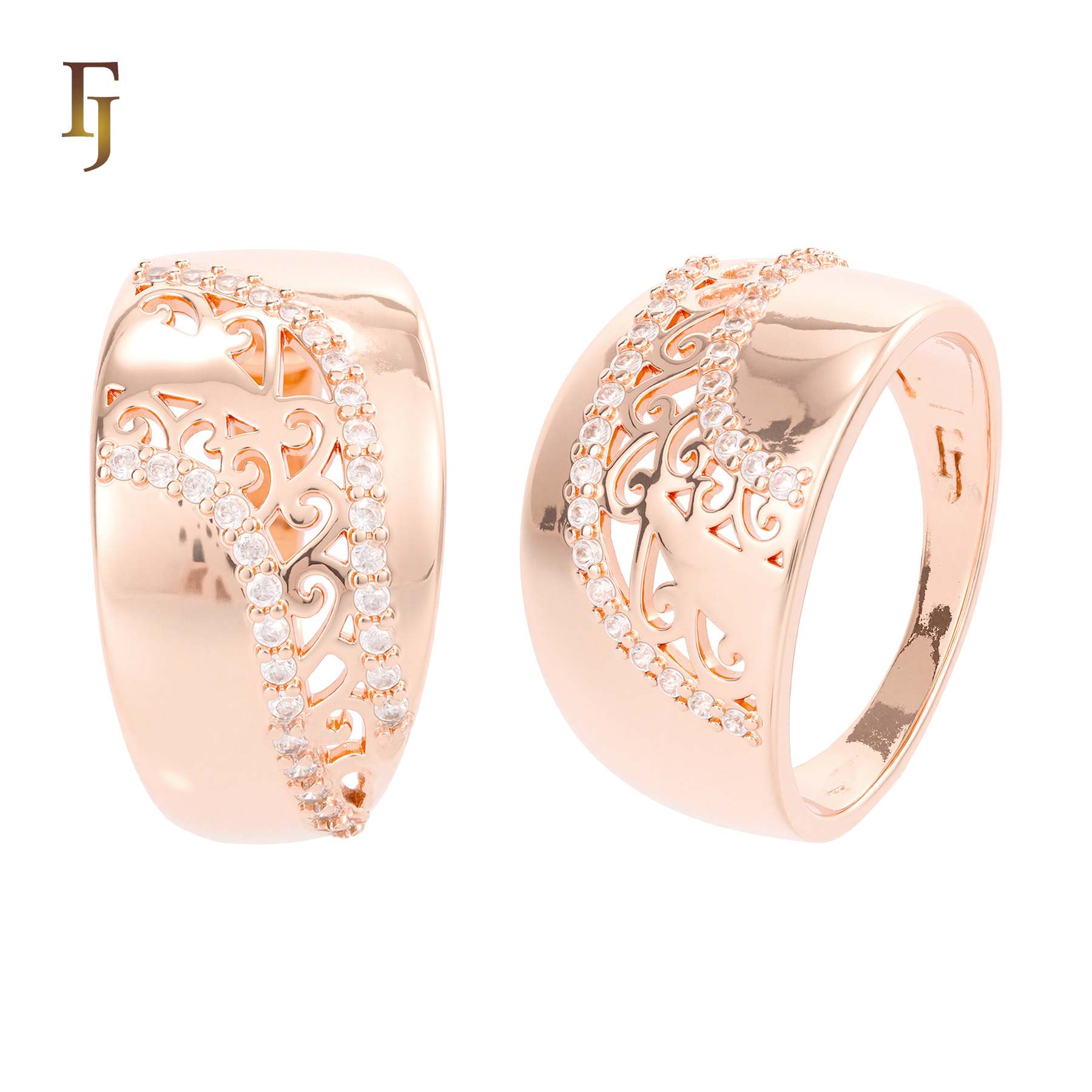 This elegant silver wide band ring features intricate filigree cutouts and sparkling CZ accents in a graceful wave design. Perfect for adding a touch of sophistication to everyday or evening wear.