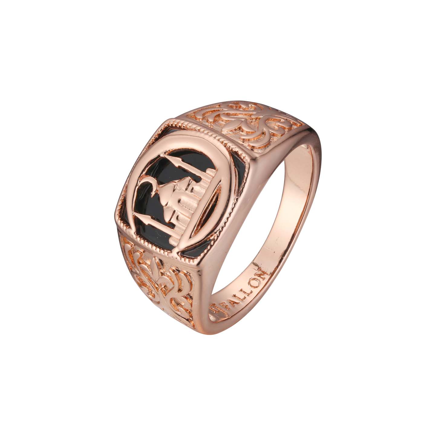 This bold Islamic men’s ring features a mosque dome silhouette set against a glossy black enamel background. The rose gold-toned stainless steel band is detailed with ornate Arabic-inspired motifs, symbolizing faith and devotion. A striking accessory for Muslim men, perfect for Eid, prayers, or everyday wear.