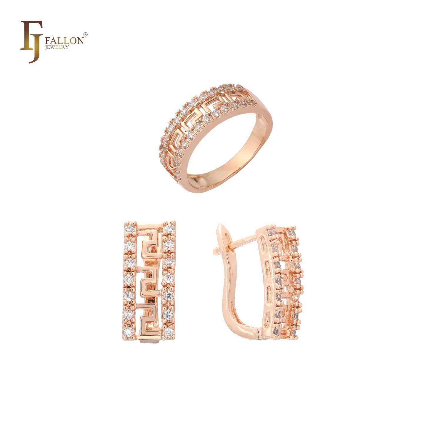 Greek key cluster set with rings in 18K Gold, Rose Gold, 14K Gold, two tone plating colors