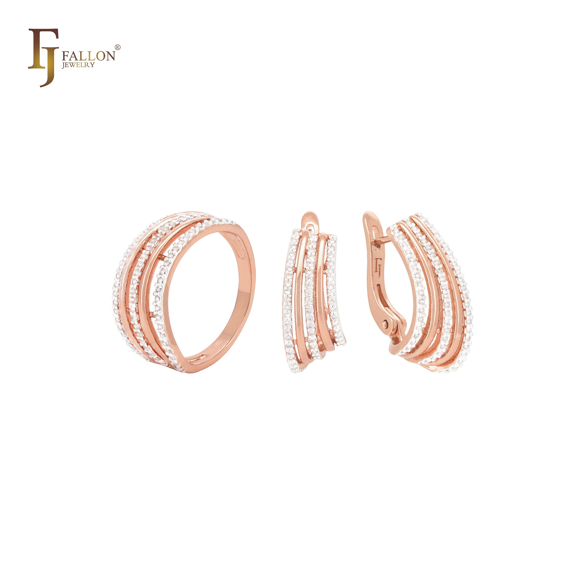 Geometric Five rows of white CZs Rose Gold two tone Jewelry Set