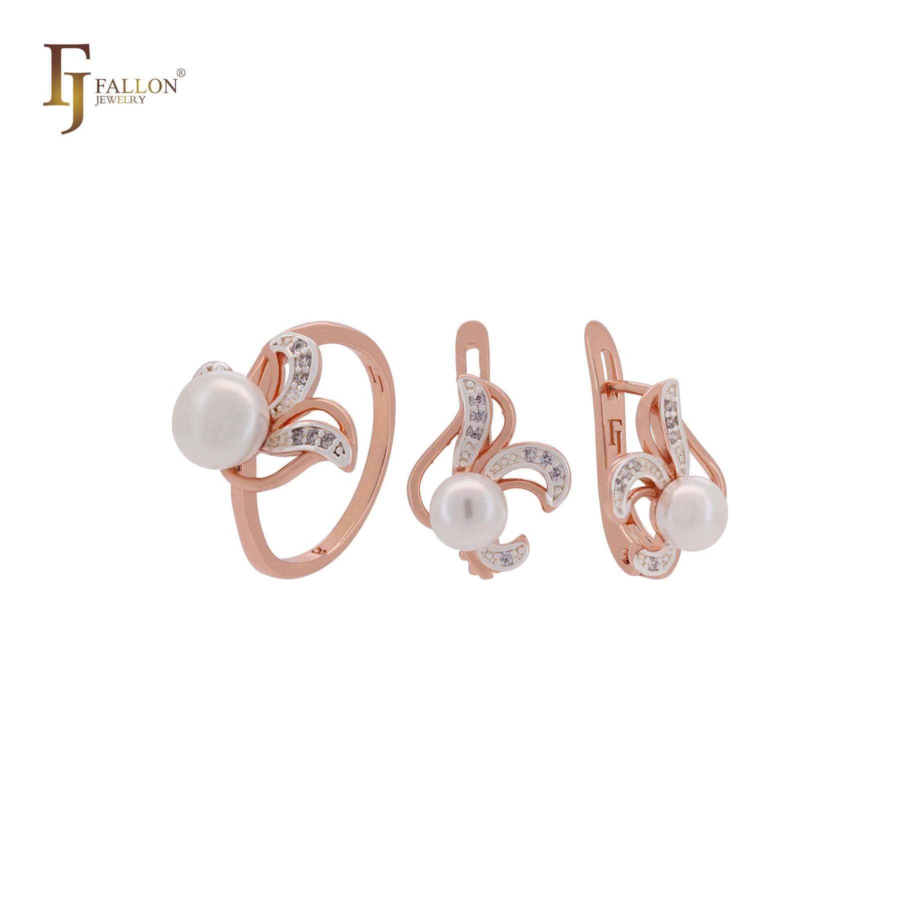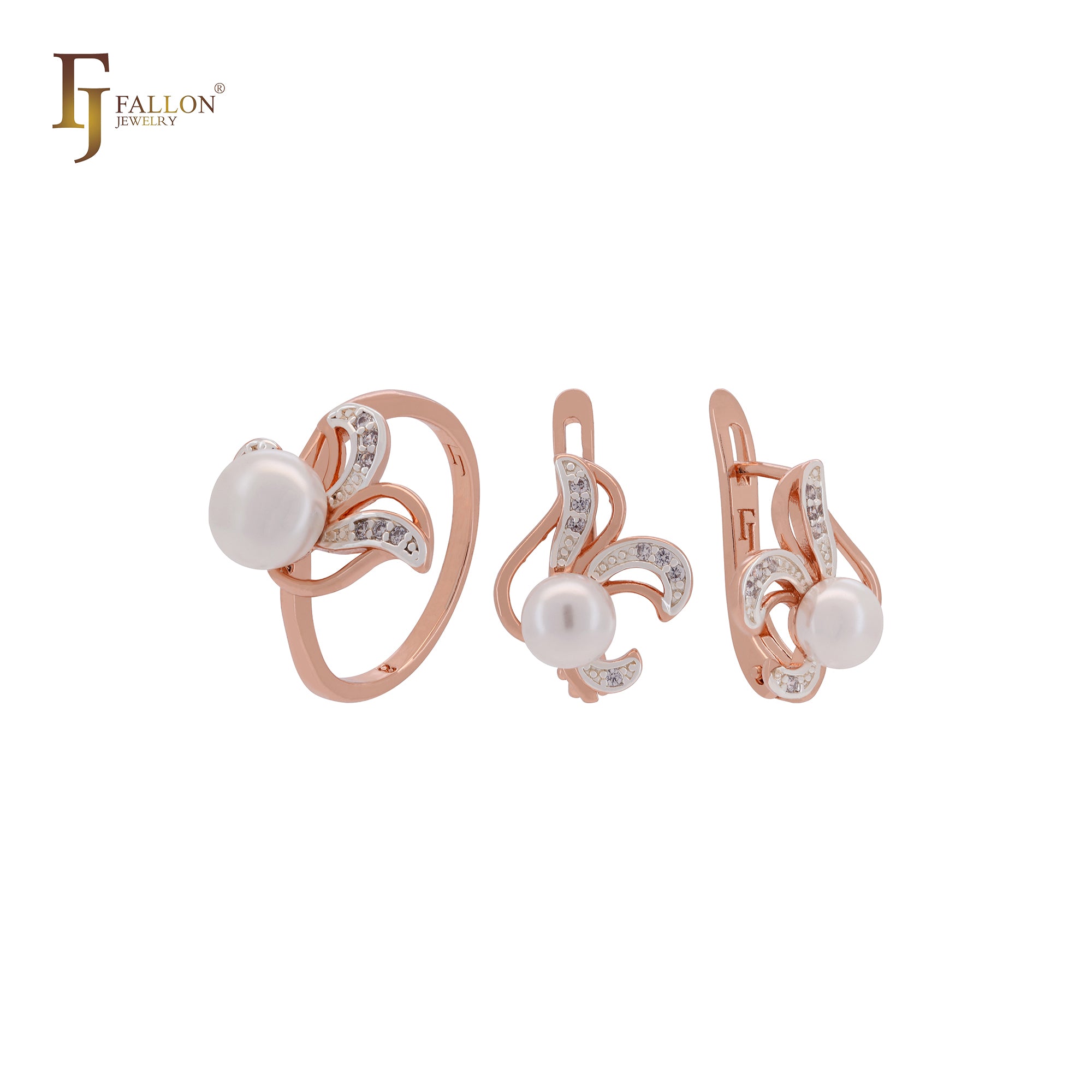 Pearl of flying flower of white CZs Rose Gold two tone Jewelry Set with Rings