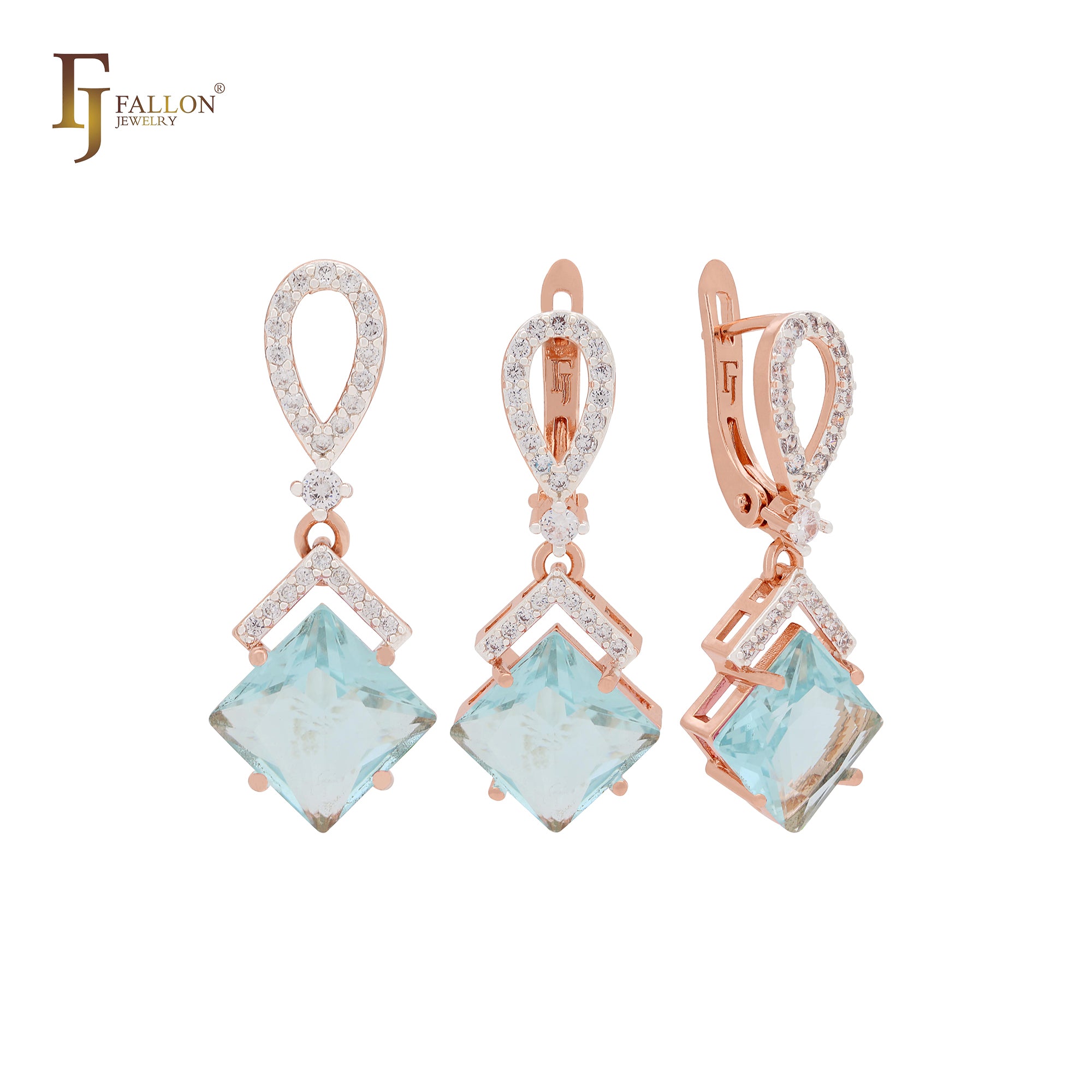 Dangling rhombus shape lake blue CZ with white CZs band Rose Gold Jewelry Set with Pendant