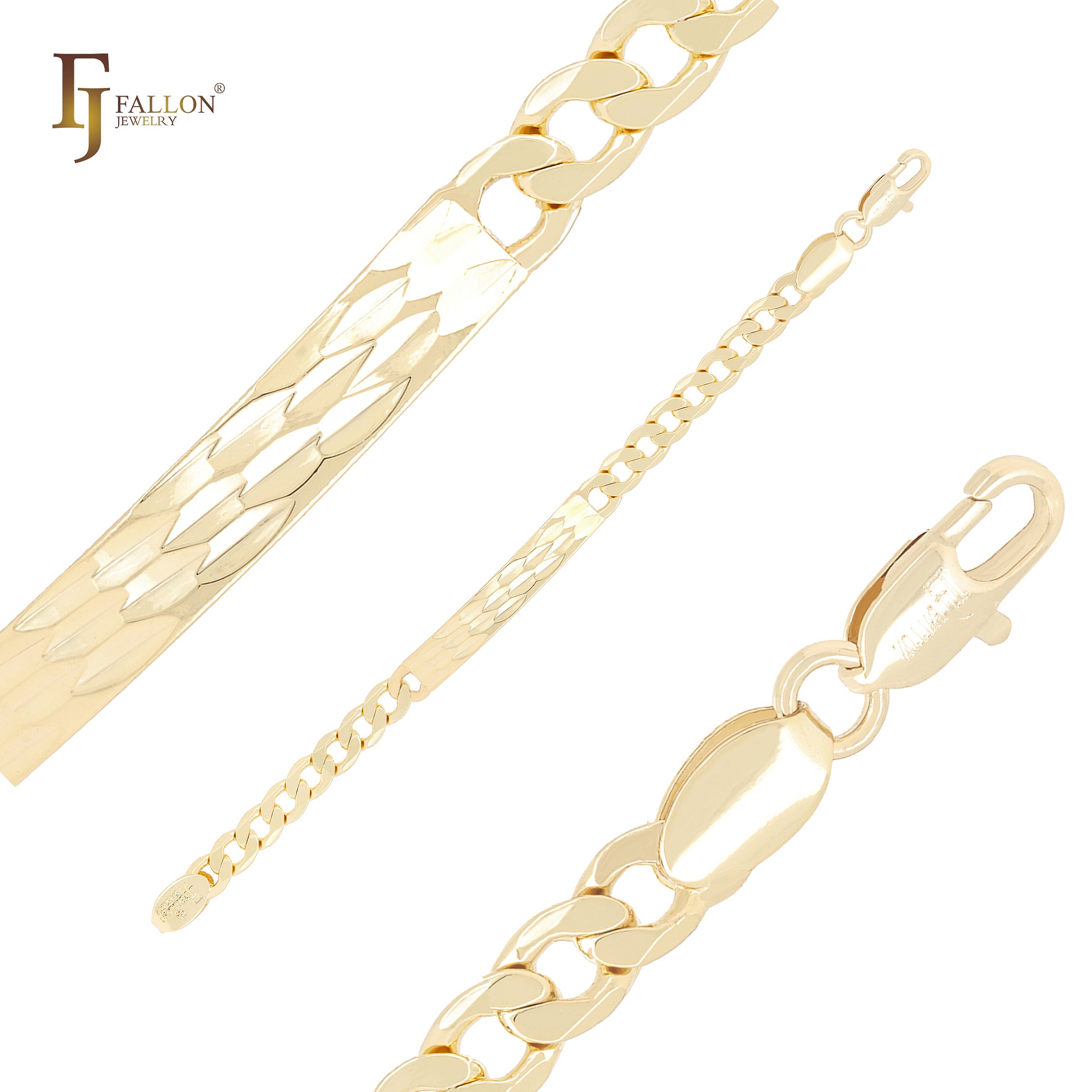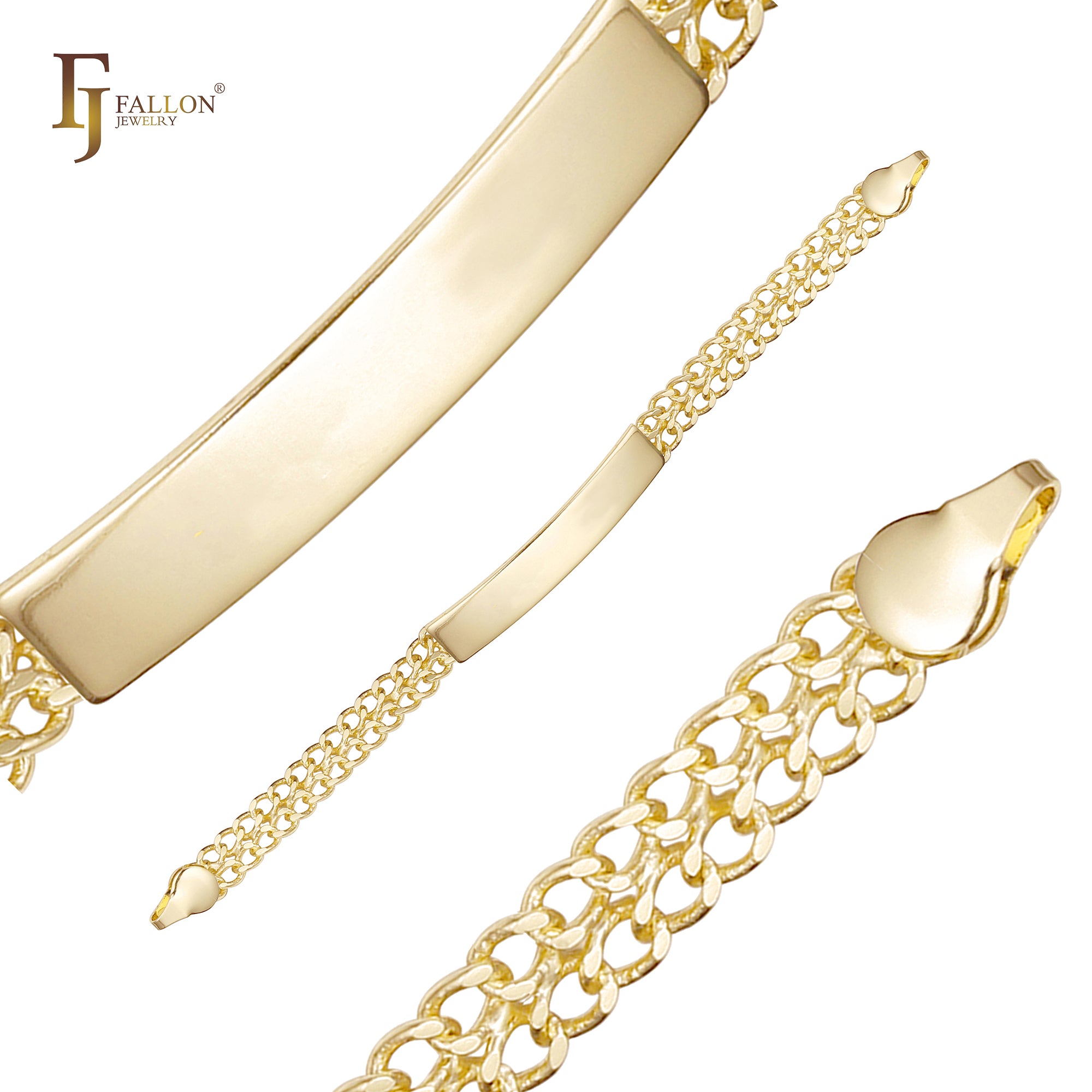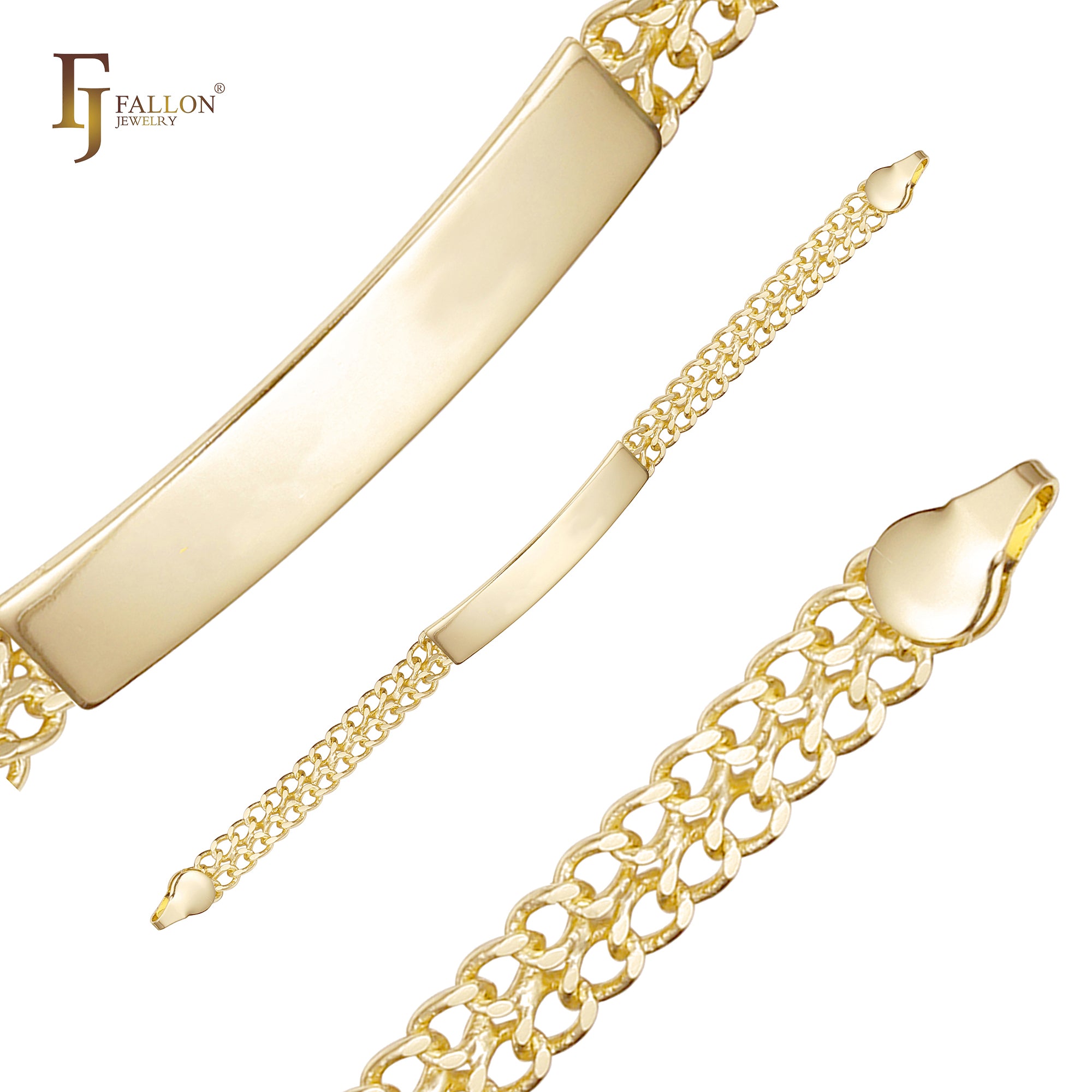 FJ Fallon Jewelry’s Men’s ID Bracelet collection is a unique product line featuring durable, masculine bracelet chains with a blank central ID plate—perfect for engraving names, dates, logos, or personalized messages after purchase. The design is ideal for resellers and brands offering custom engraving services to end consumers.
