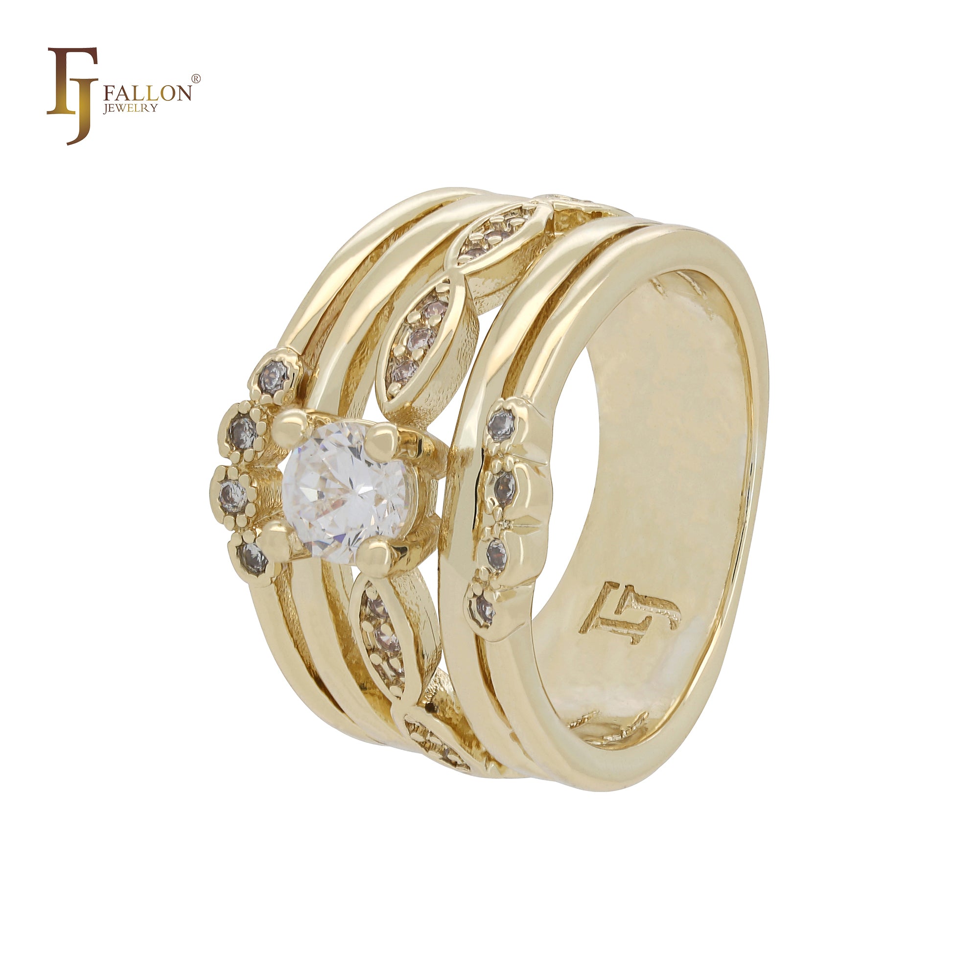 Wide solitaire triple band wedding rings plated in 14K Gold